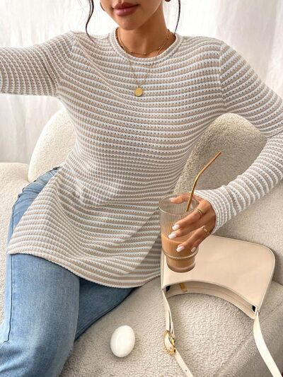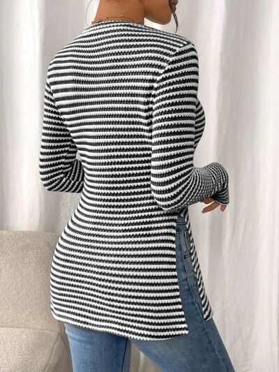 Slit Striped Long Sleeve Casual T-Shirt