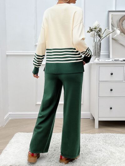 Slit Striped Round Neck Top and Pants Sweater Set