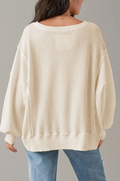 Slit Waffle-Knit Round Neck Long Sleeve Top