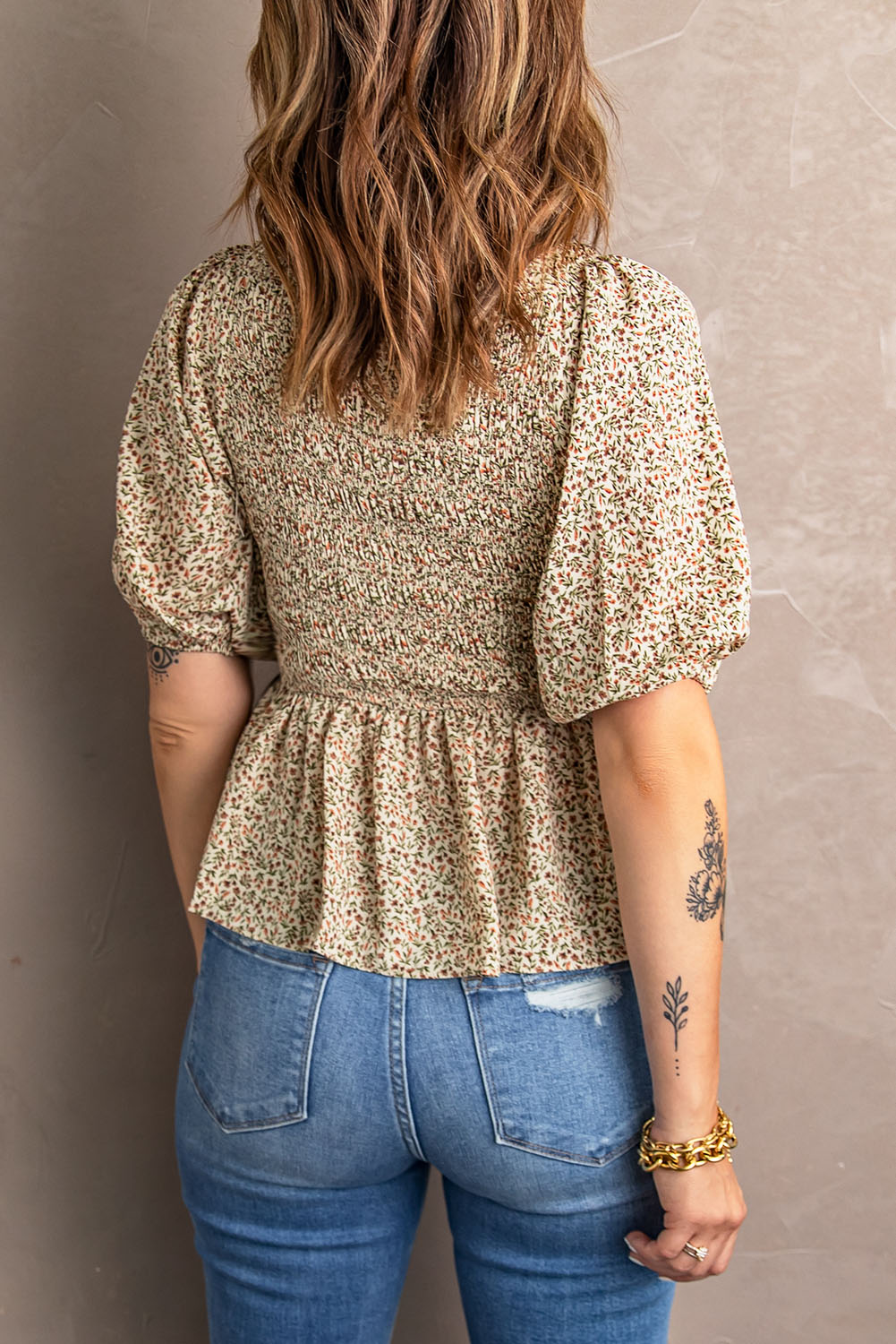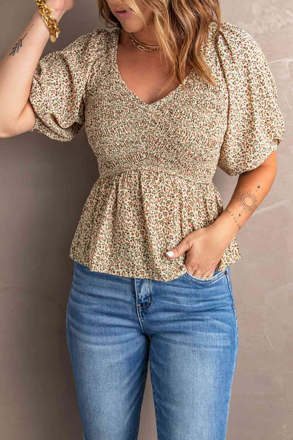 Smocked Balloon Sleeve Peplum Blouse