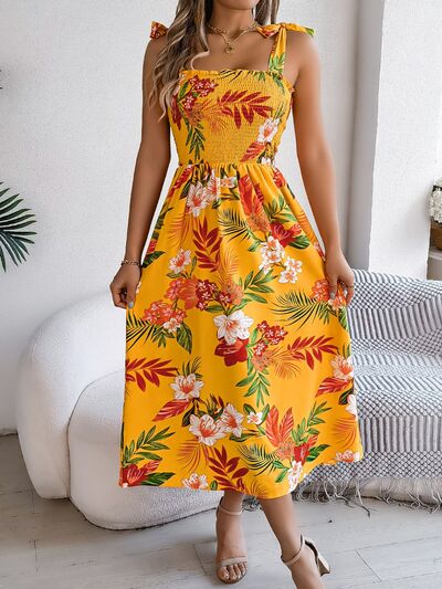 Smocked Floral Tie Shoulder Midi Dress