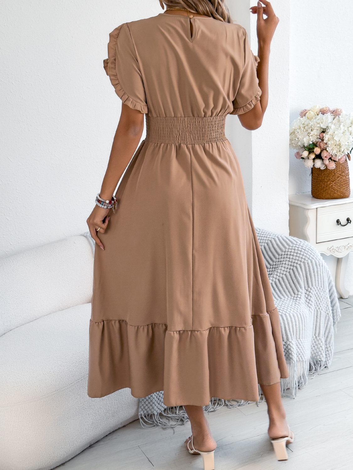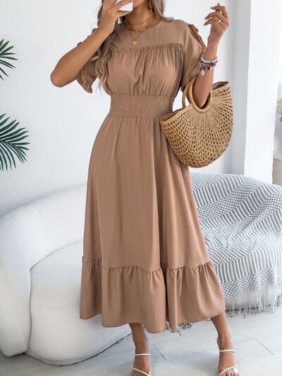 Smocked Frill Round Neck Midi Dress