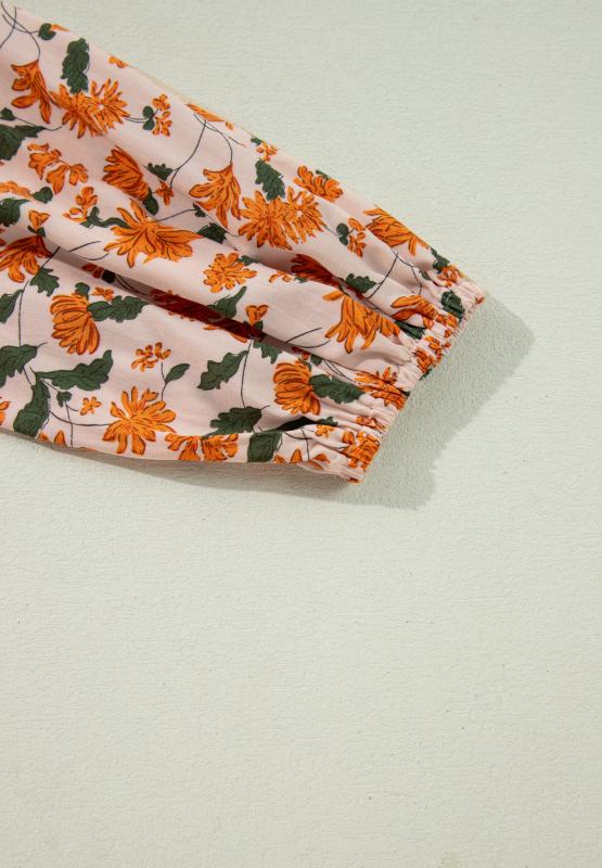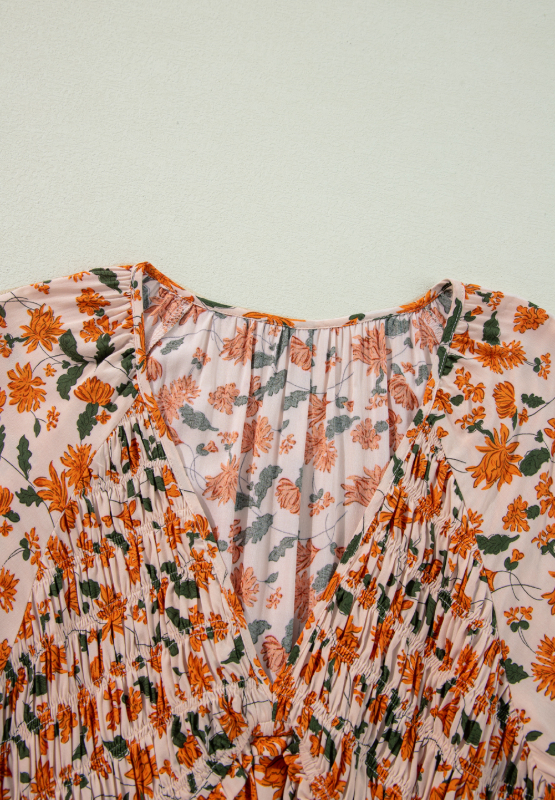 Smocked Printed V-Neck Long Sleeve Dress