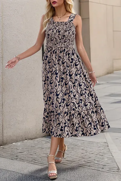 Smocked Printed Wide Strap Dress
