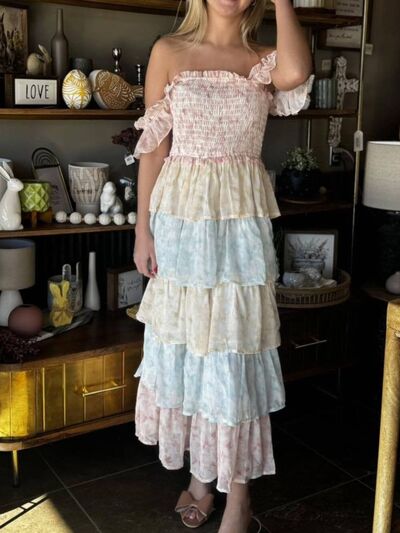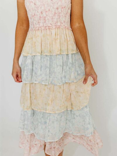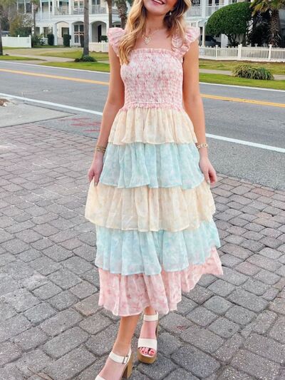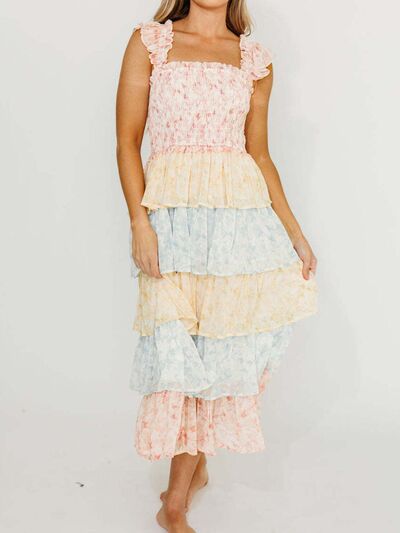 Smocked Ruffle Layered Floral Midi Dress