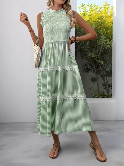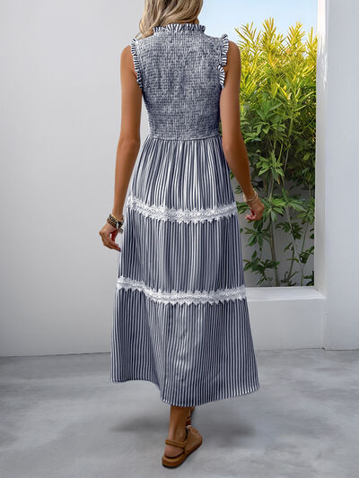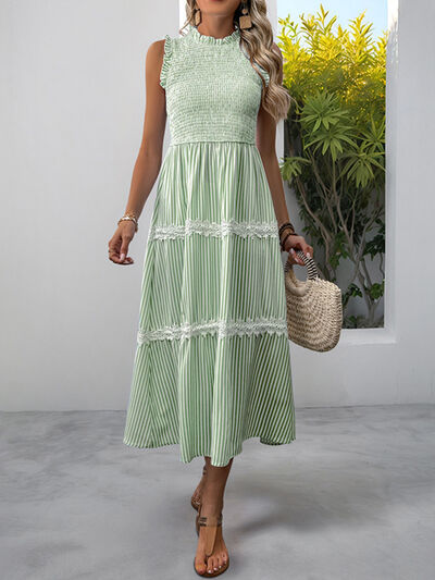 Smocked Striped Lace Trim Sleeveless Midi Dress
