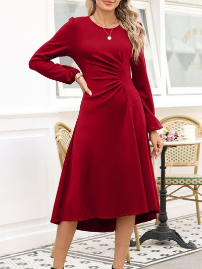 Solid Color Ruched Detail Long Sleeve Midi Dress