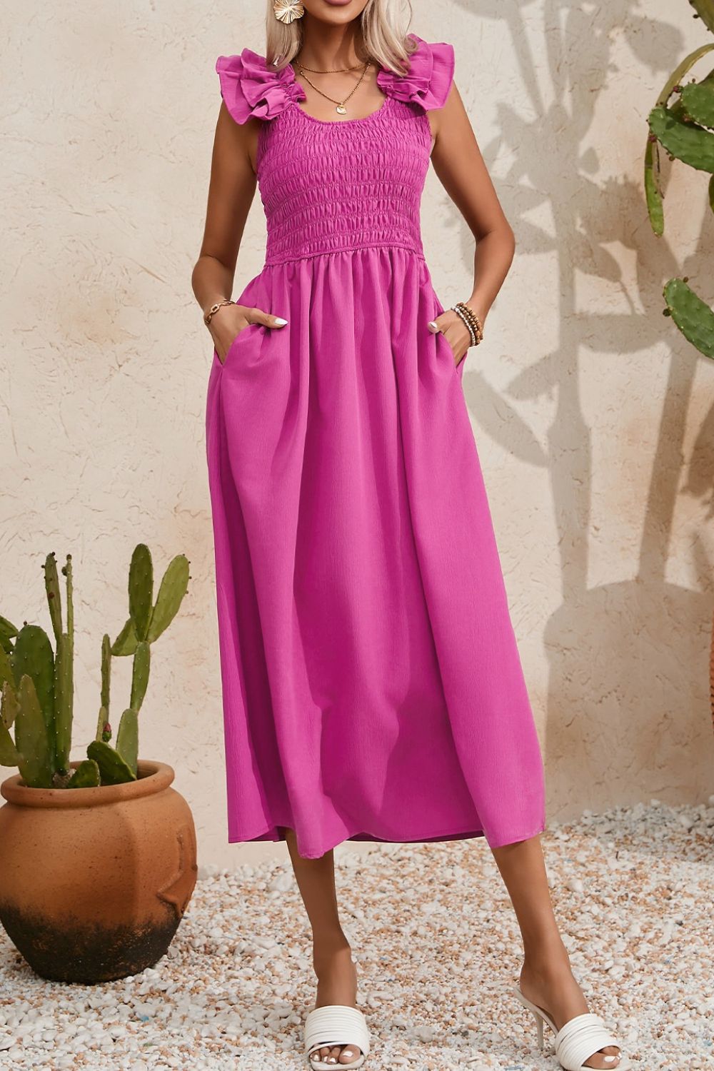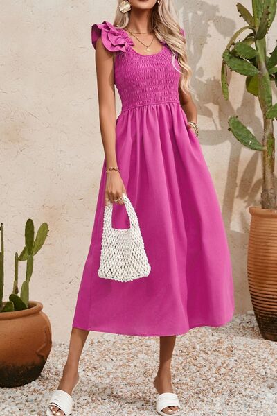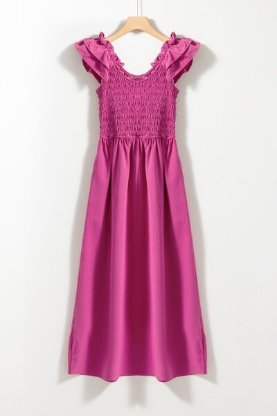 Solid Color Ruffled Straps Smocked Ruched Maxi Dress
