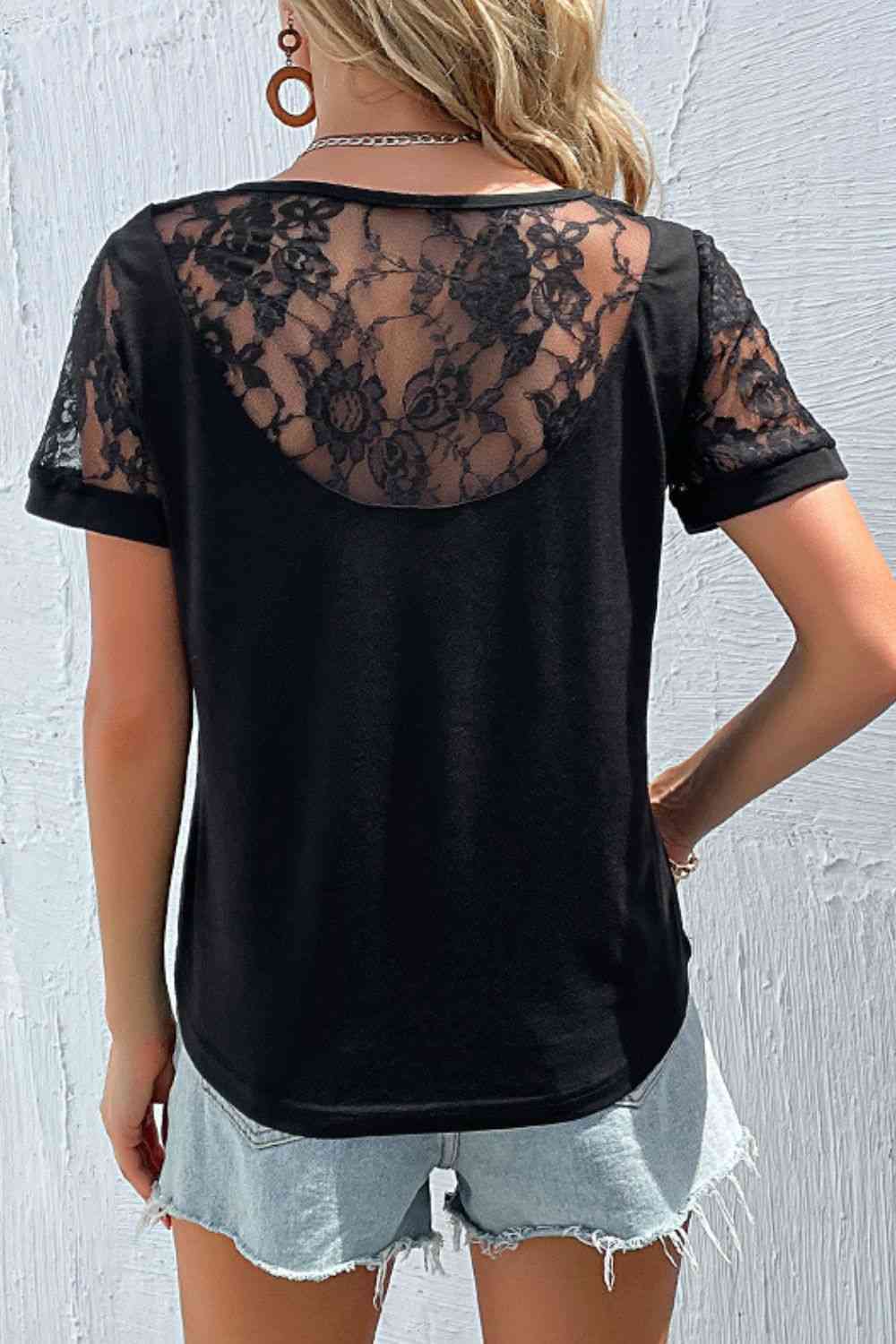 Spliced Lace Round Neck Short Sleeve Top