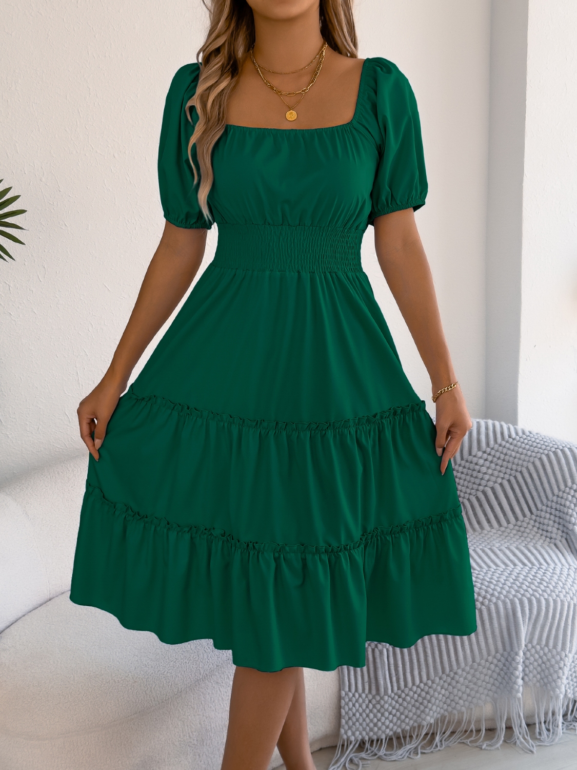 Square Neck Short Puff Sleeve Dress