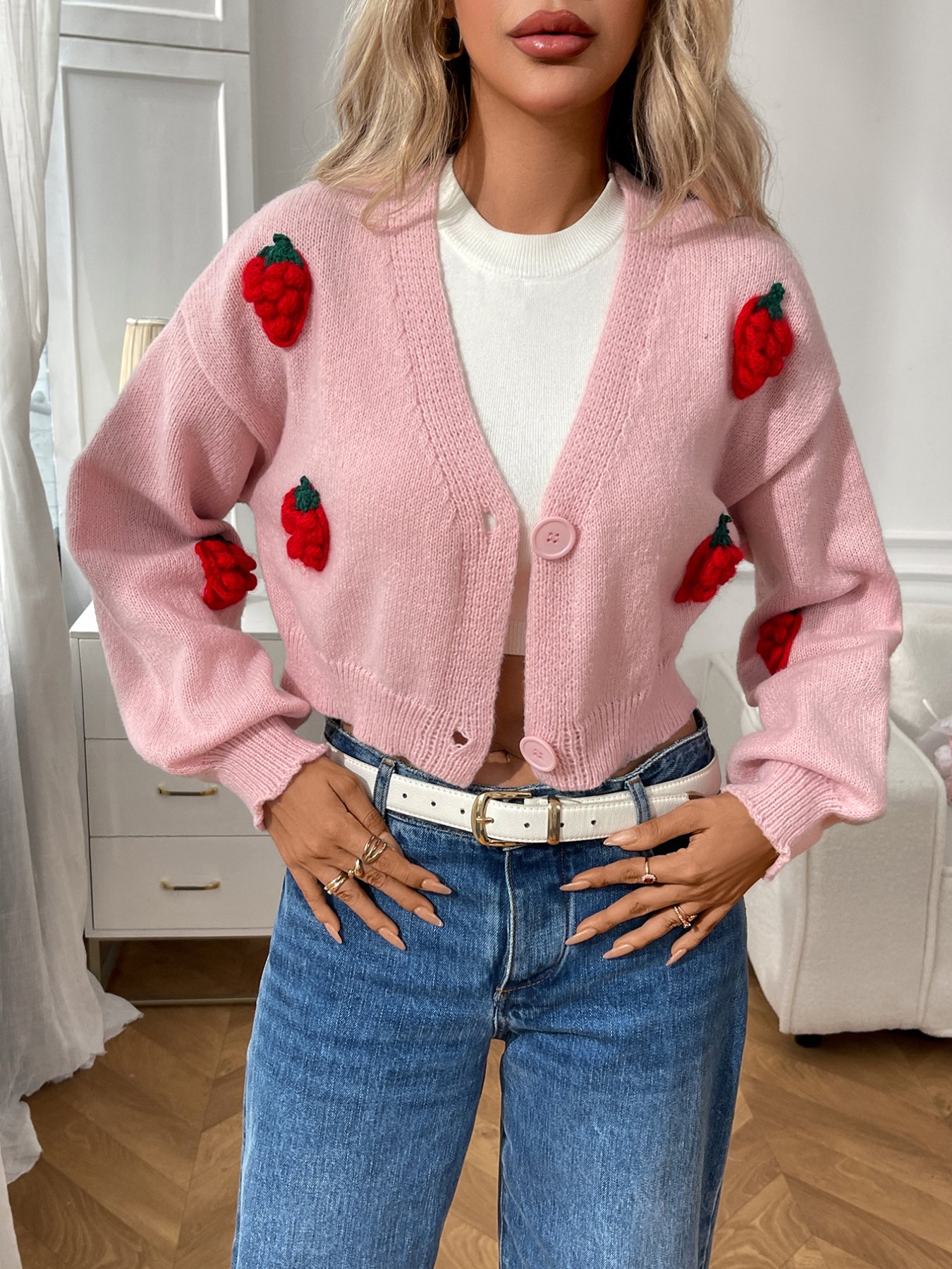 Strawberry Cropped Button-Up Cardigan