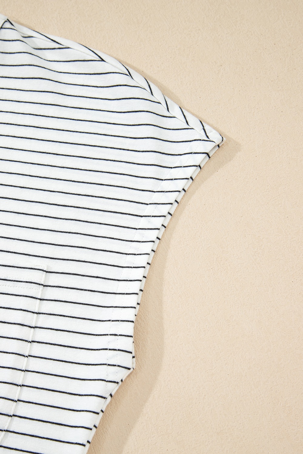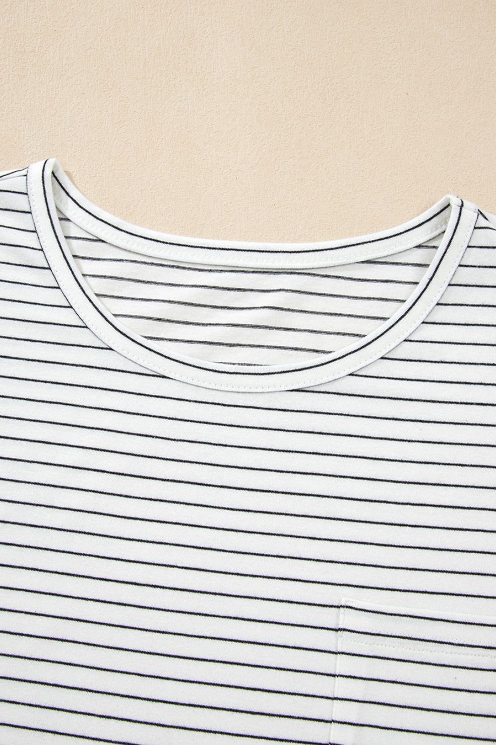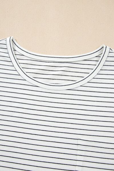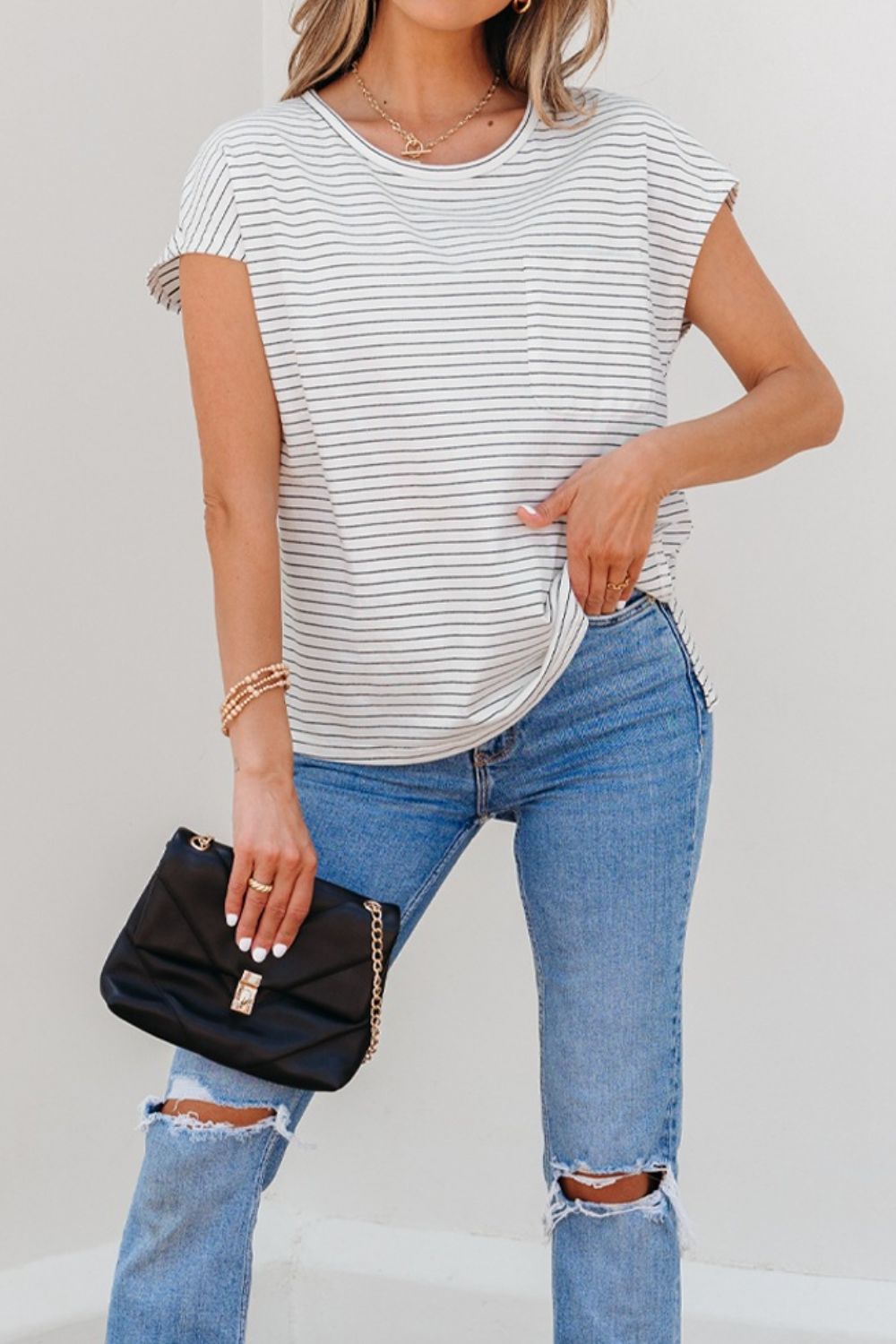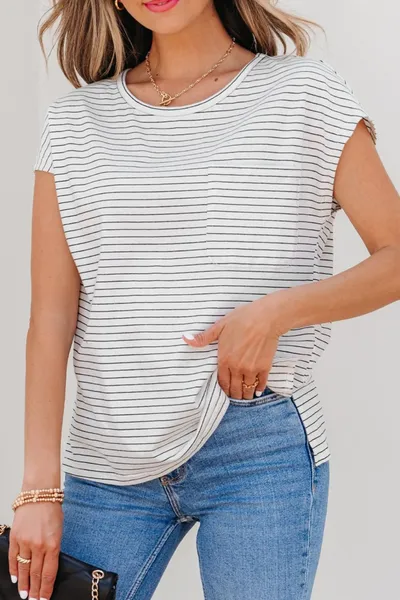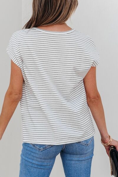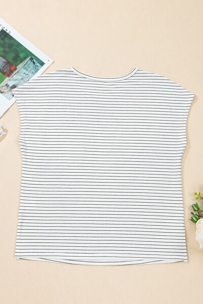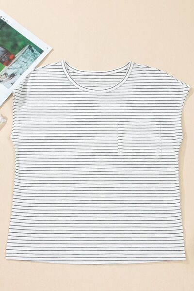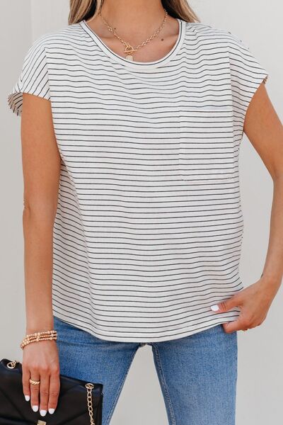 Stripe Cap Sleeve Crew Neck Casual Tee with Chest Pocket