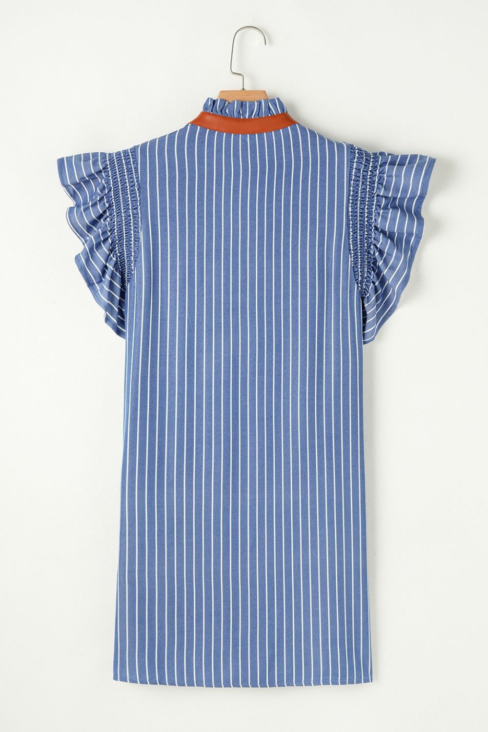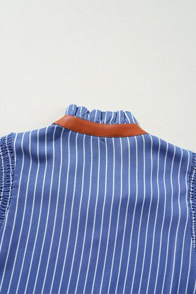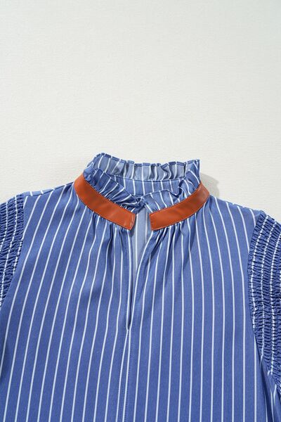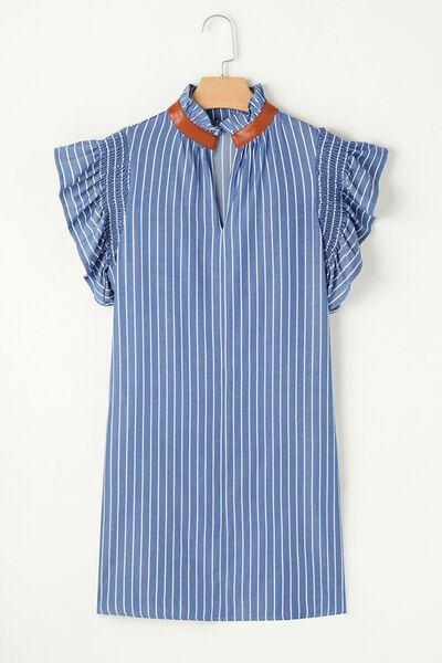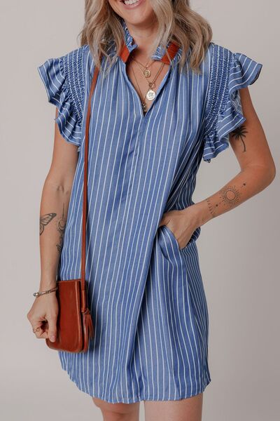 Stripe Frilly Split Neck Shirred Ruffle Sleeve Short Shift Dress
