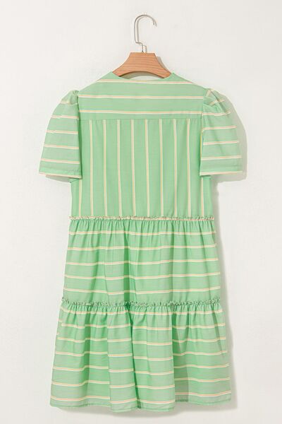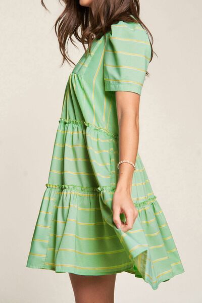 Stripe V Neck Short Sleeve Frilled Detail Dress