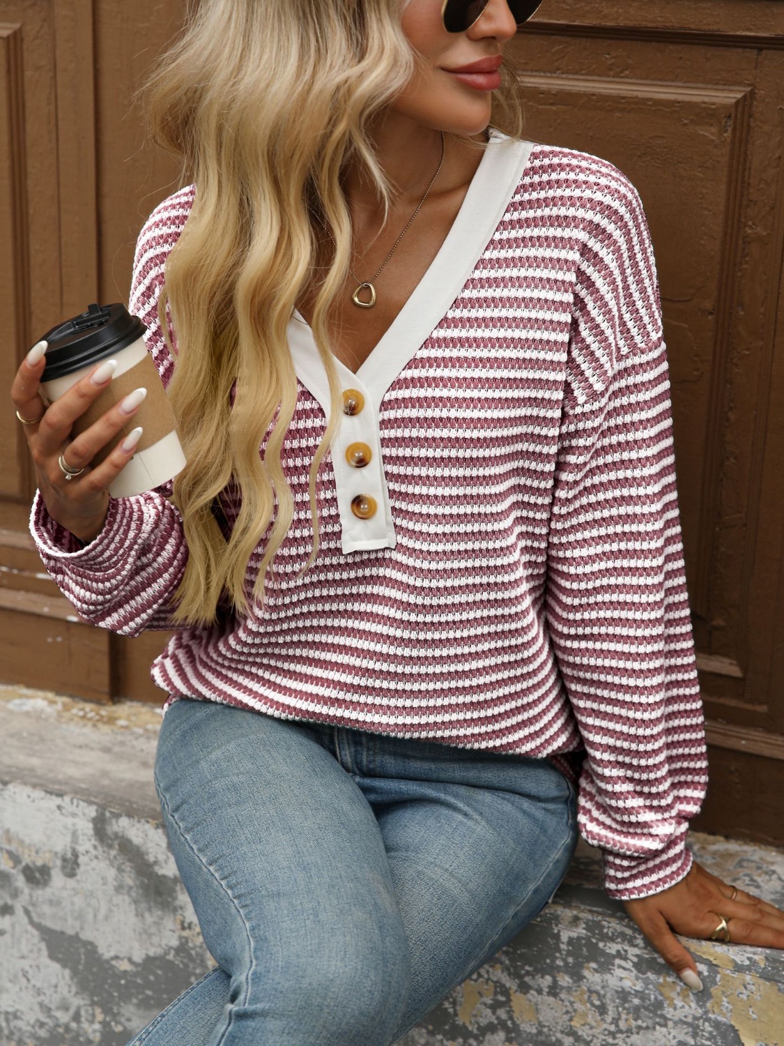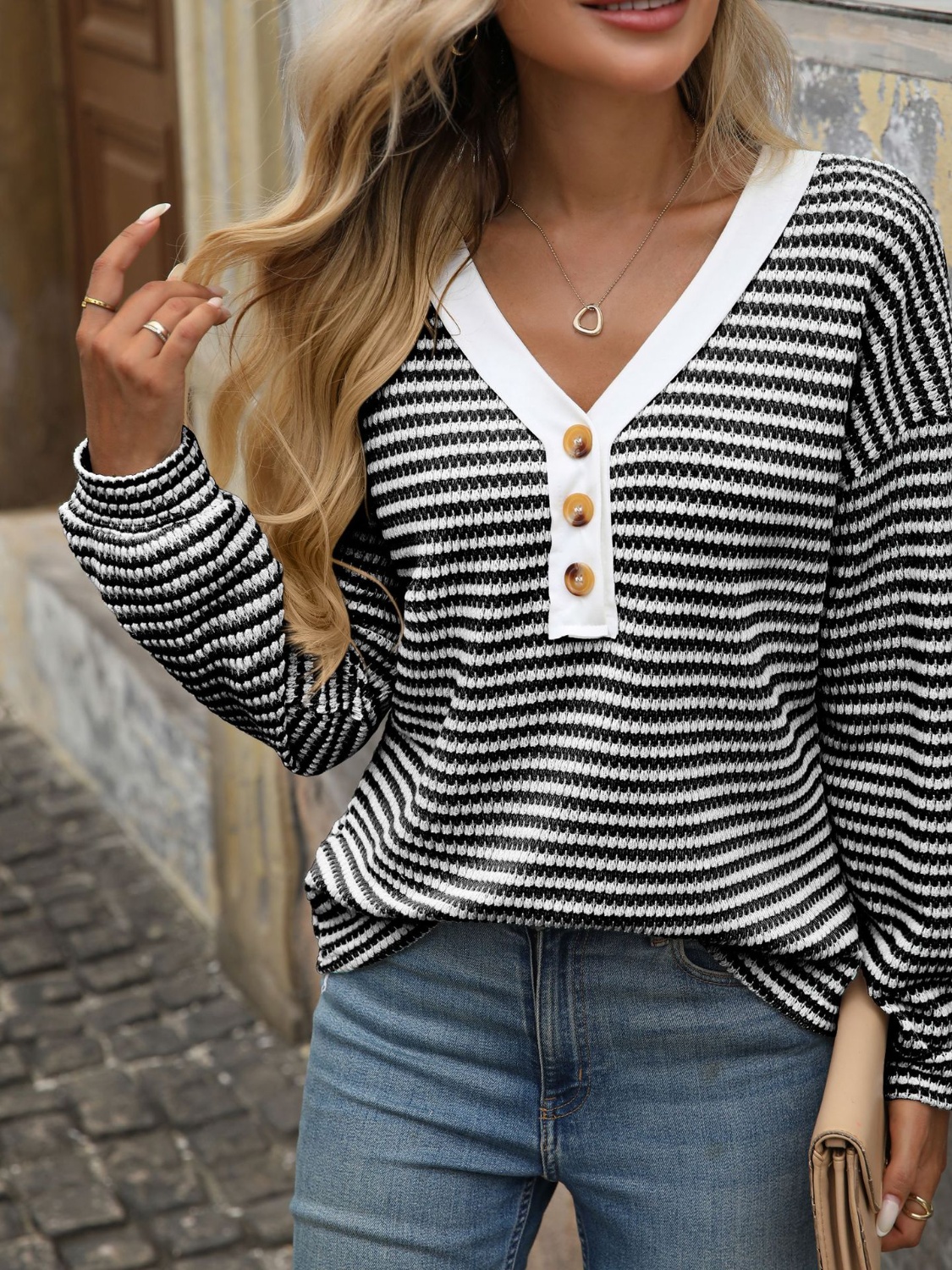 Striped Button Detail Long Sleeve T-Shirt