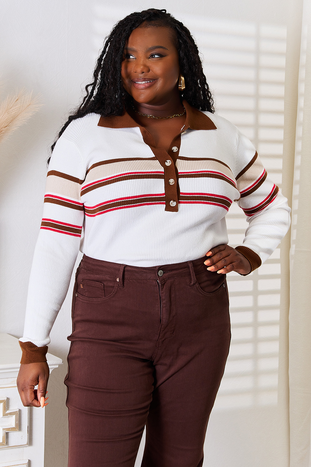 Striped Collared Neck Rib-Knit Top