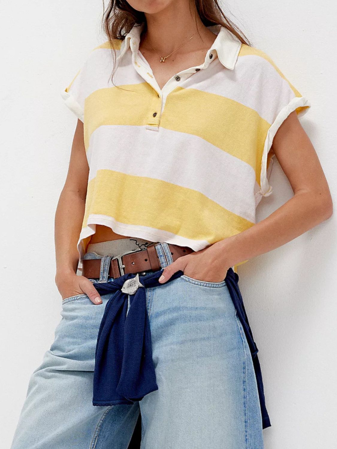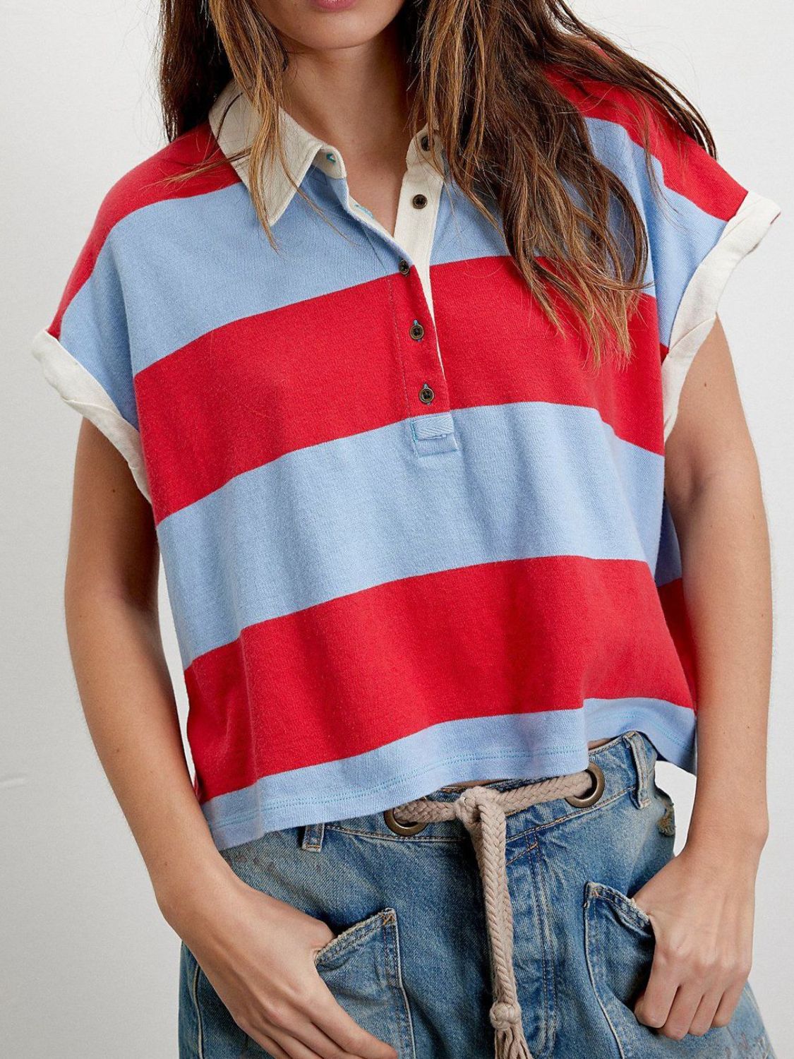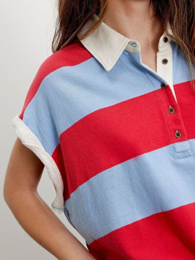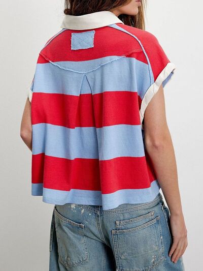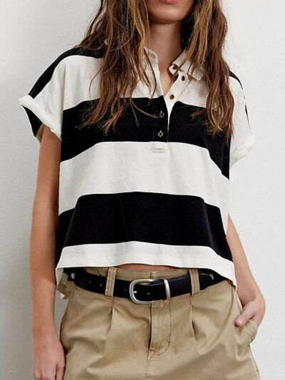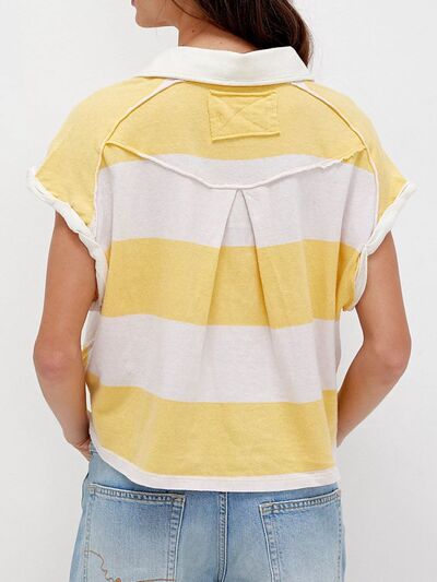 Striped Collared Neck Short Sleeve Top