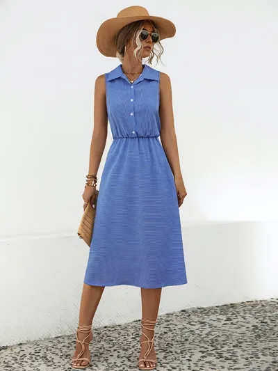 Striped Collared Neck Sleeveless Midi Dress
