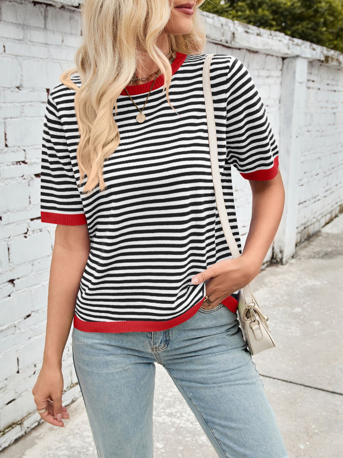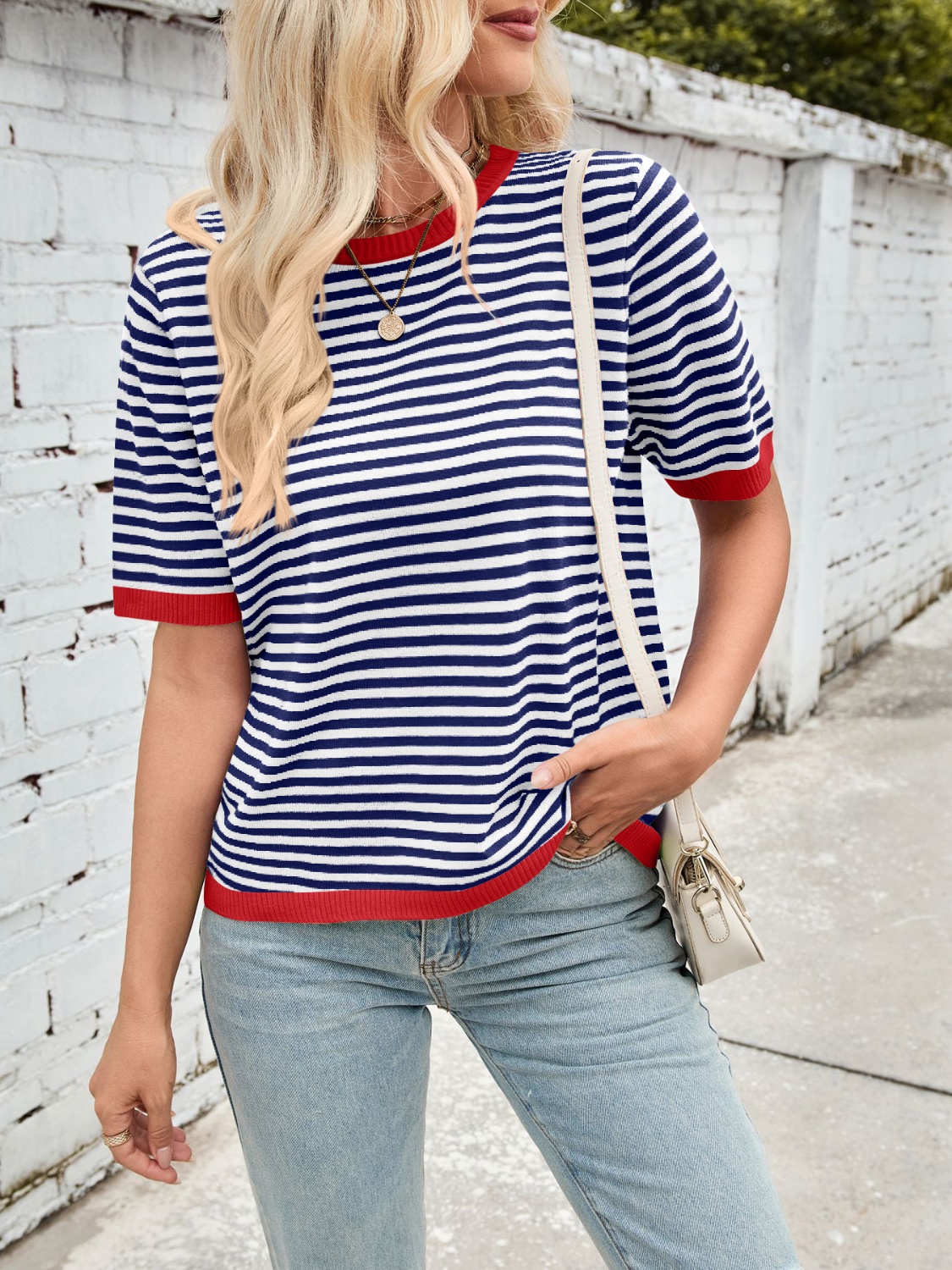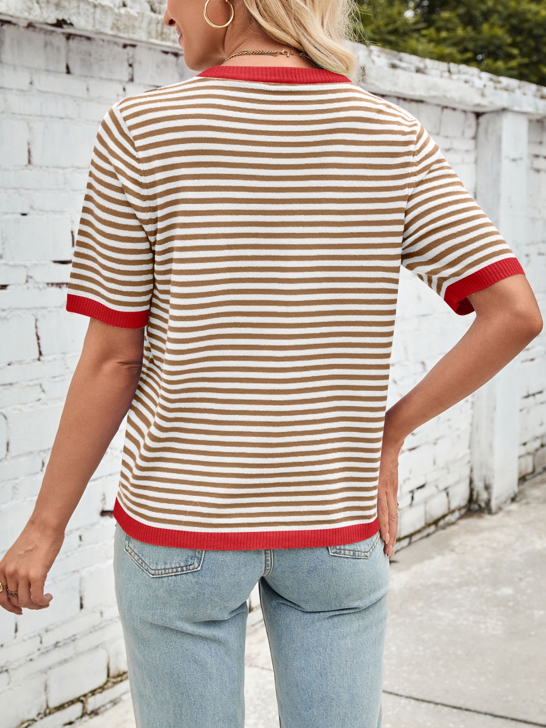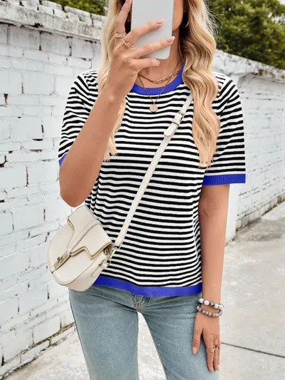 Striped Contrast Round Neck Half Sleeve Knit Top