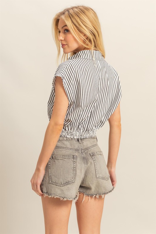 Striped Elastic Hem Johnny Collar Cap Sleeve Blouse