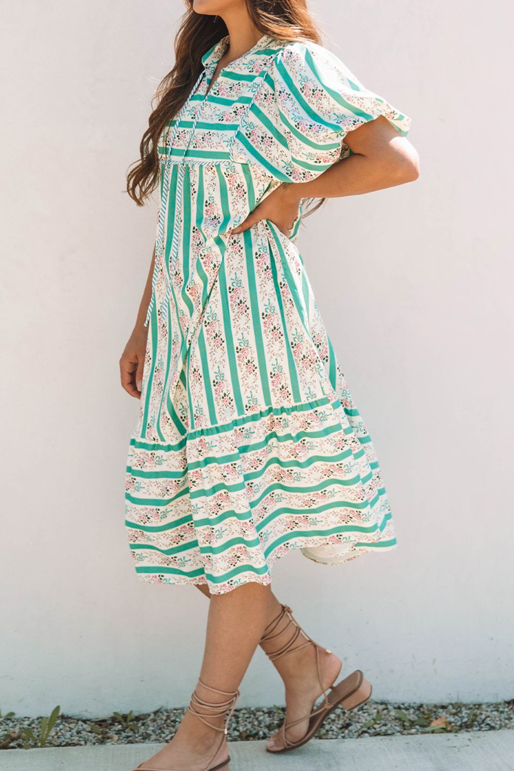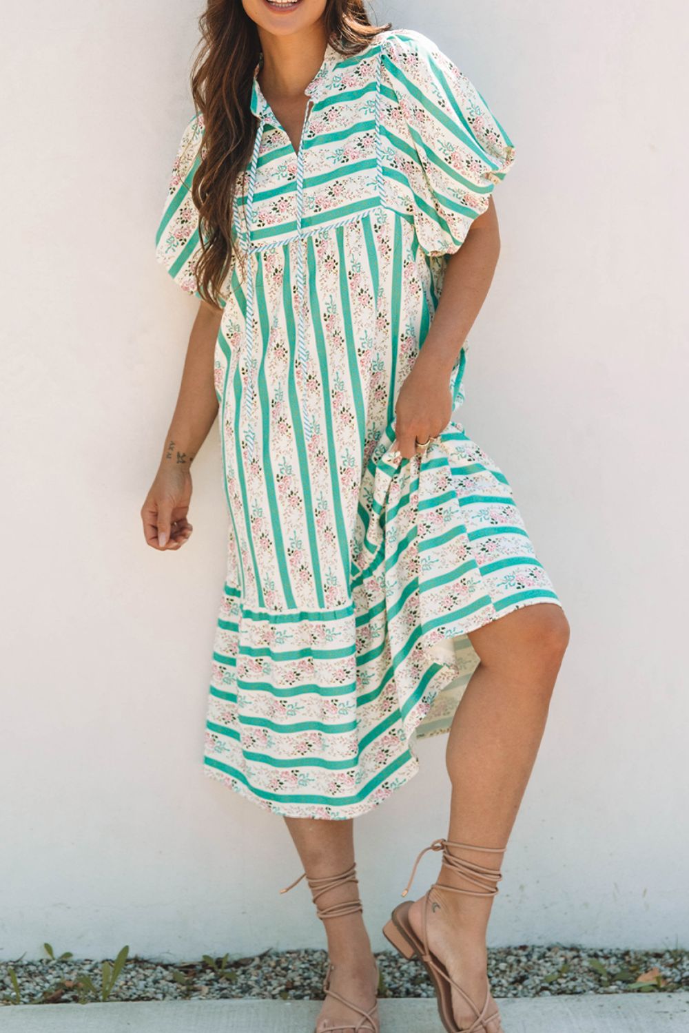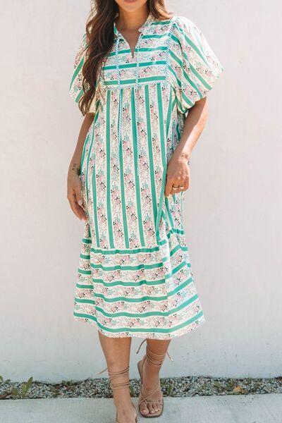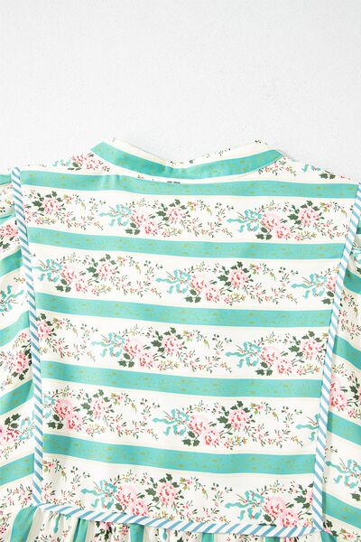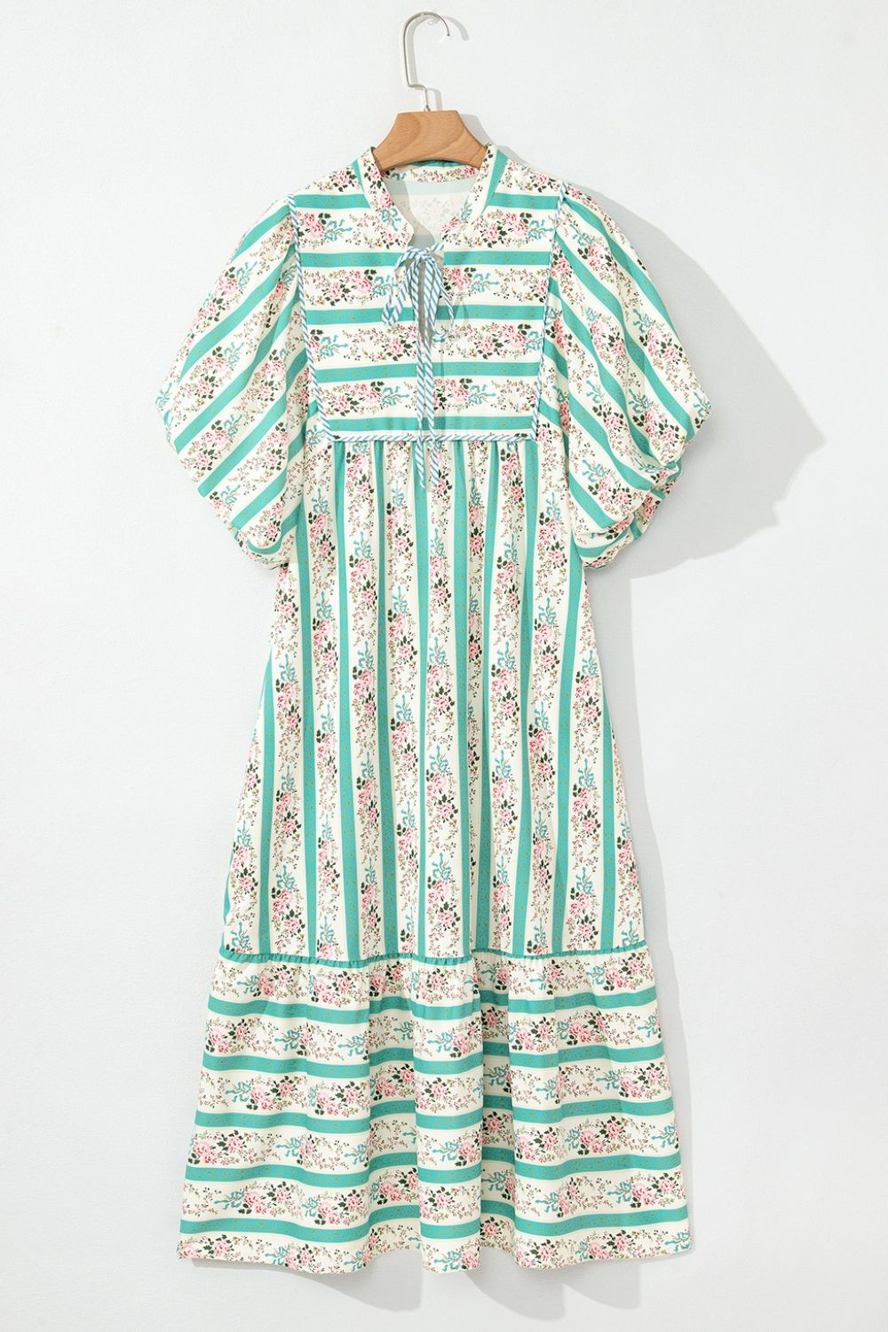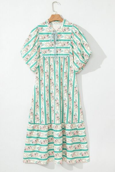 Striped Floral Print Tie Neck Puff Sleeve Midi Dress