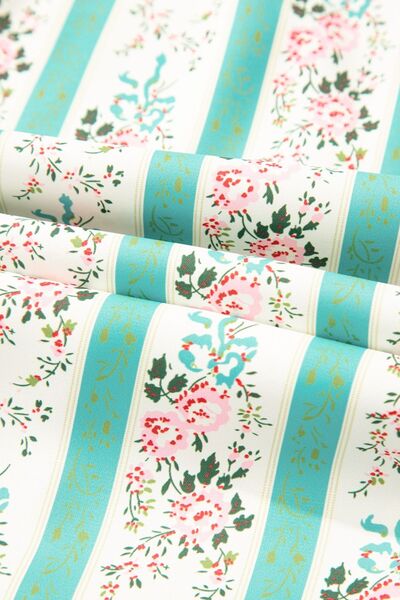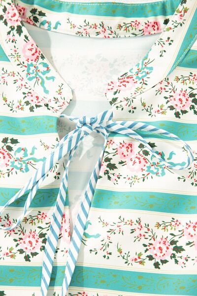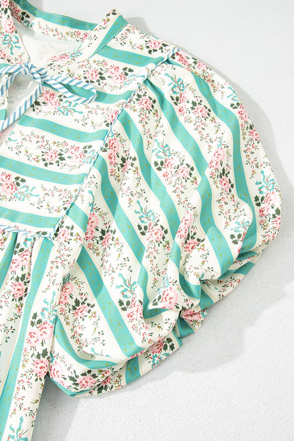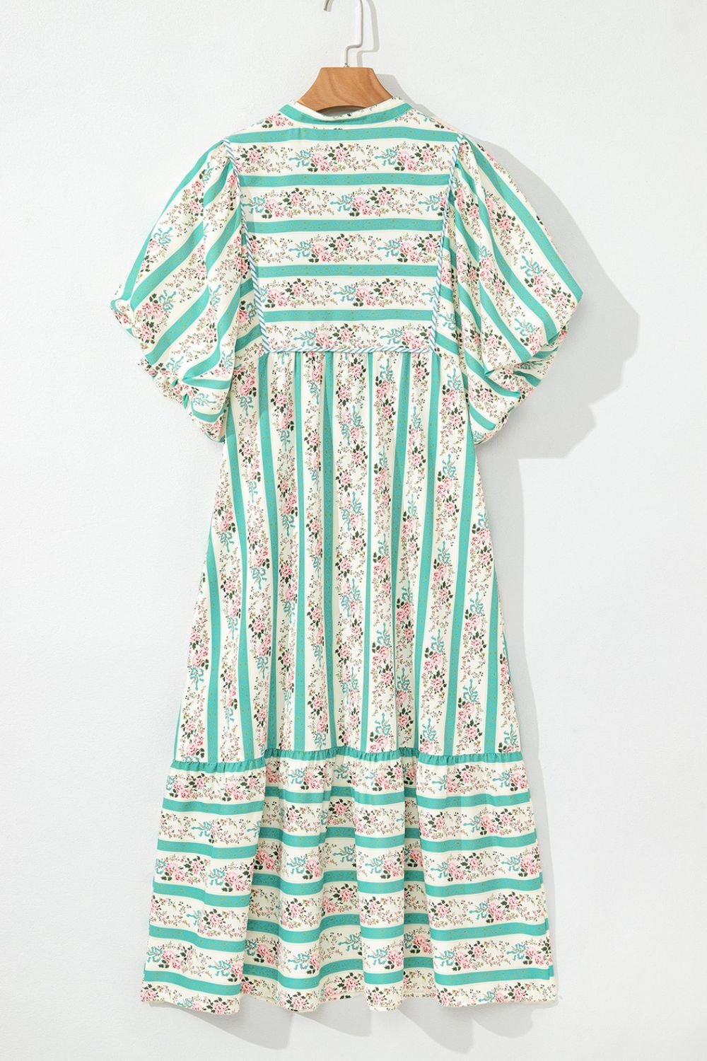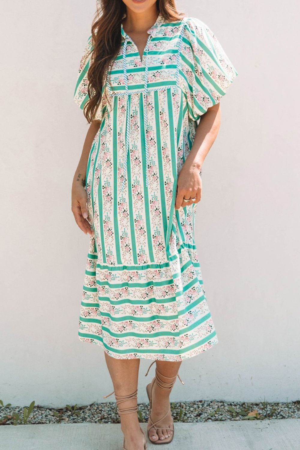 Striped Floral Print Tie Neck Puff Sleeve Midi Dress