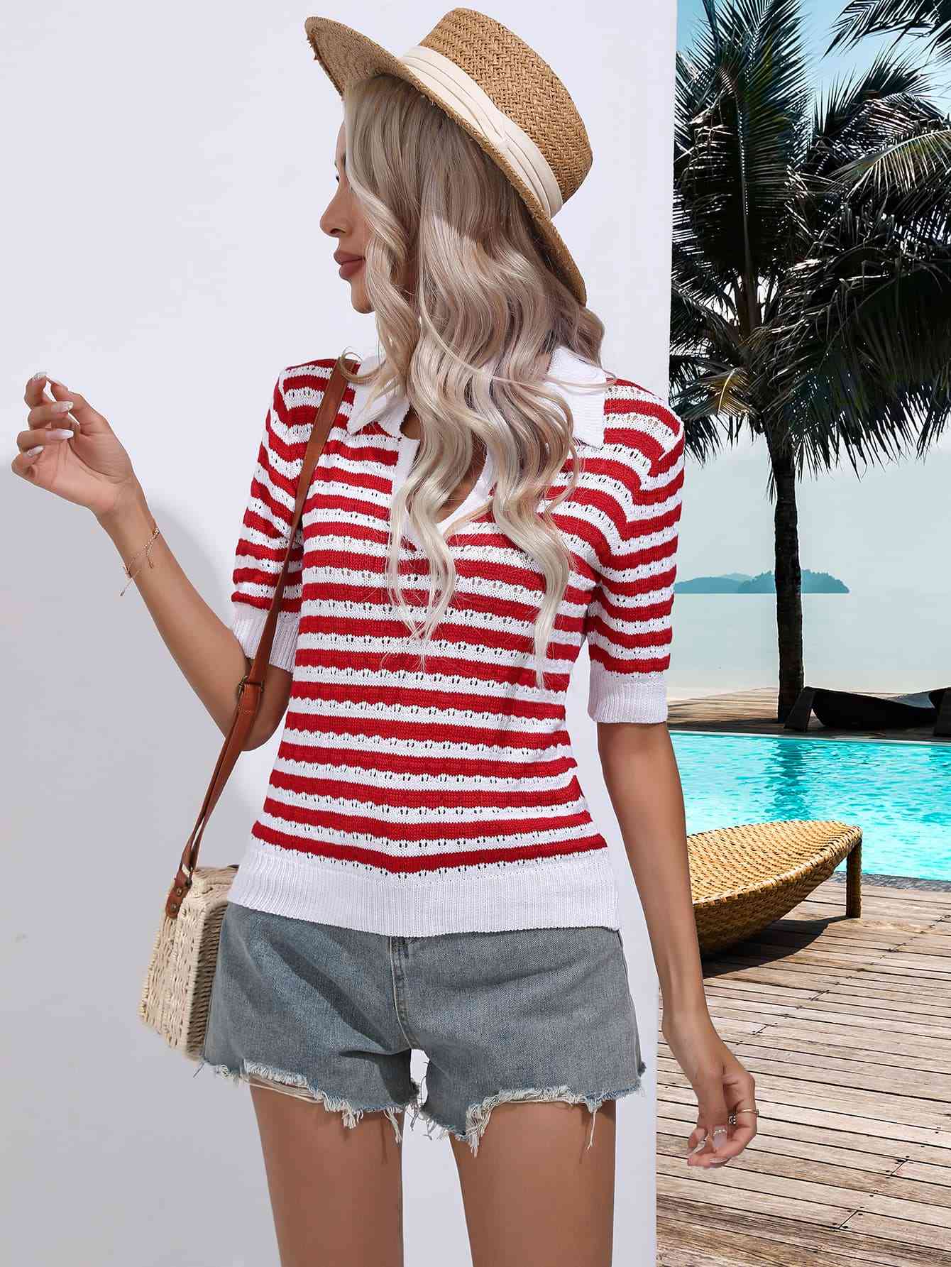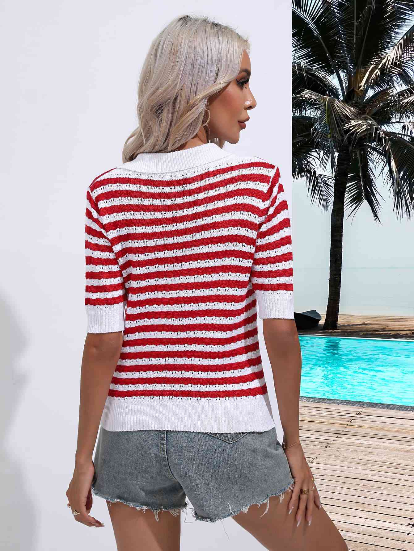 Striped Johnny Collar Half Sleeve Knit Top