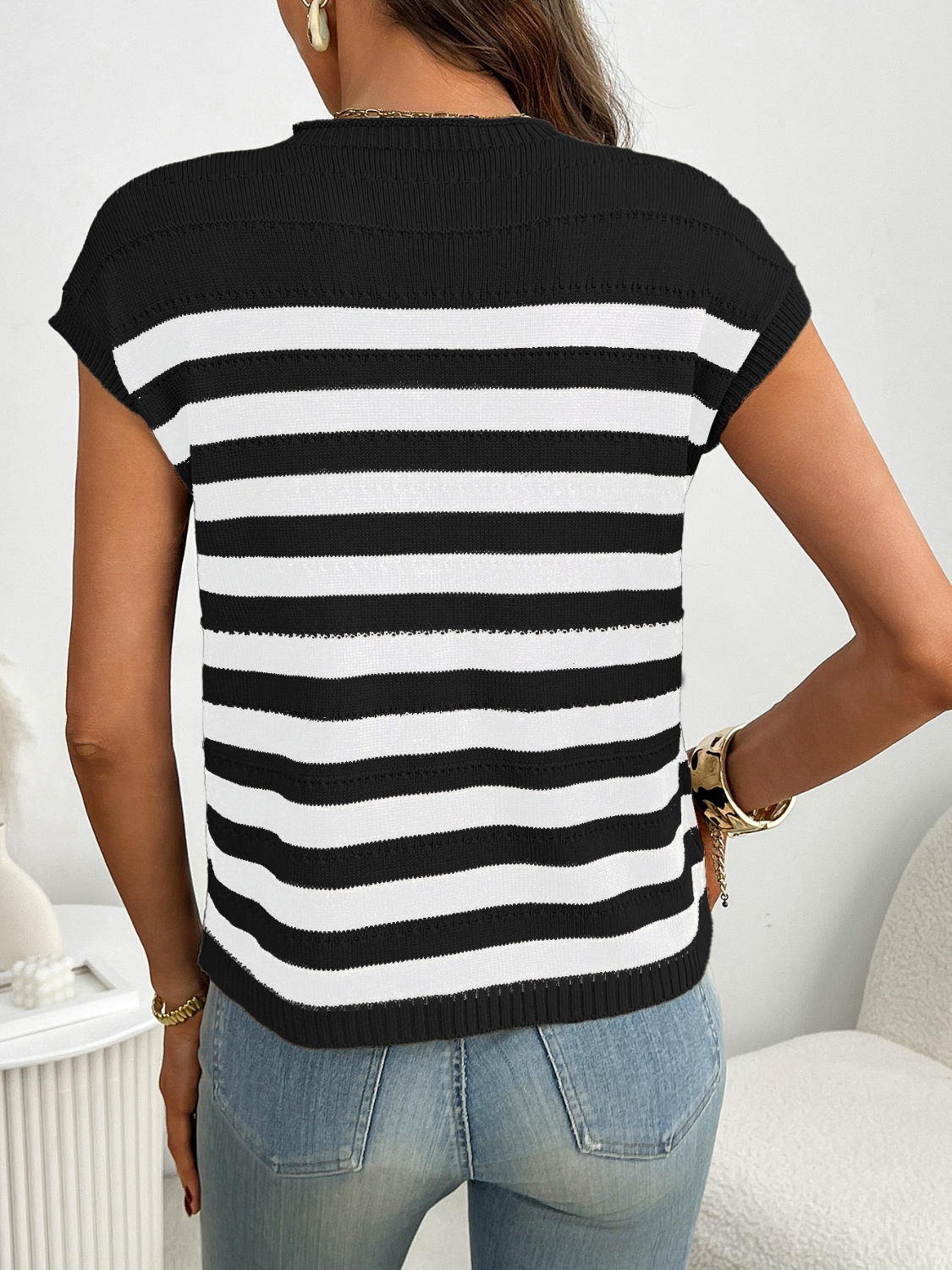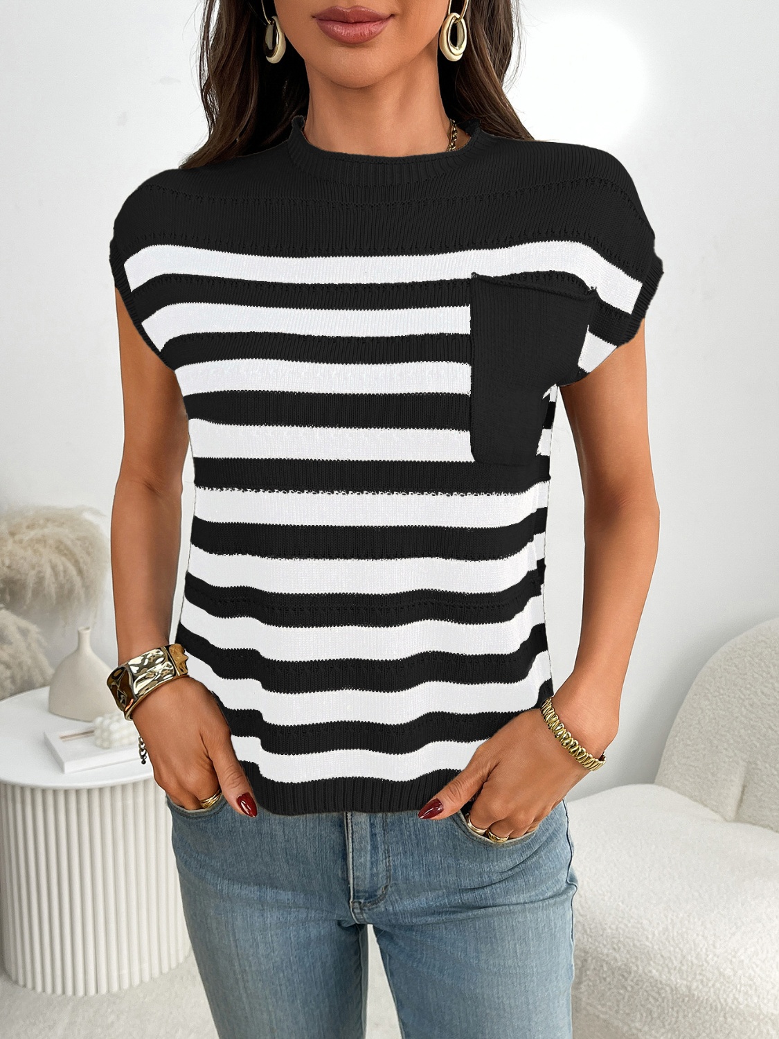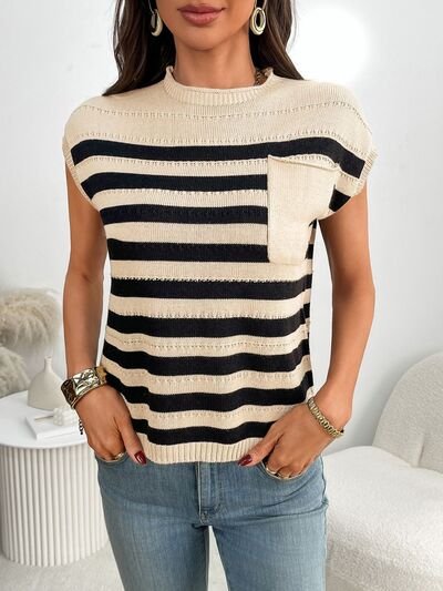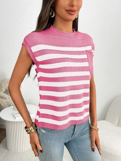 Striped Mock Neck Cap Sleeve Knit Top