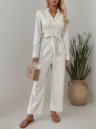 Striped Notched Long Sleeve Tie Waist Jumpsuit