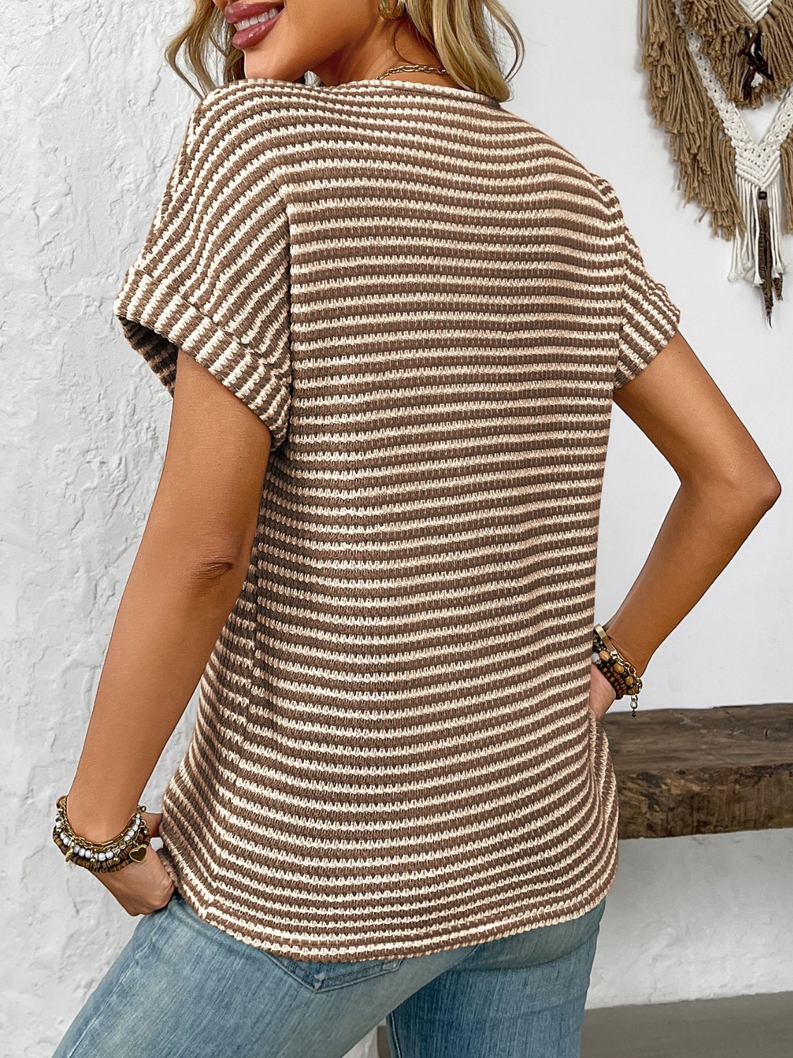 Striped Notched Short Sleeve T-Shirt