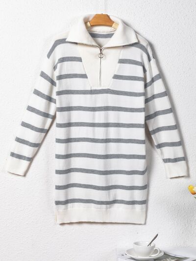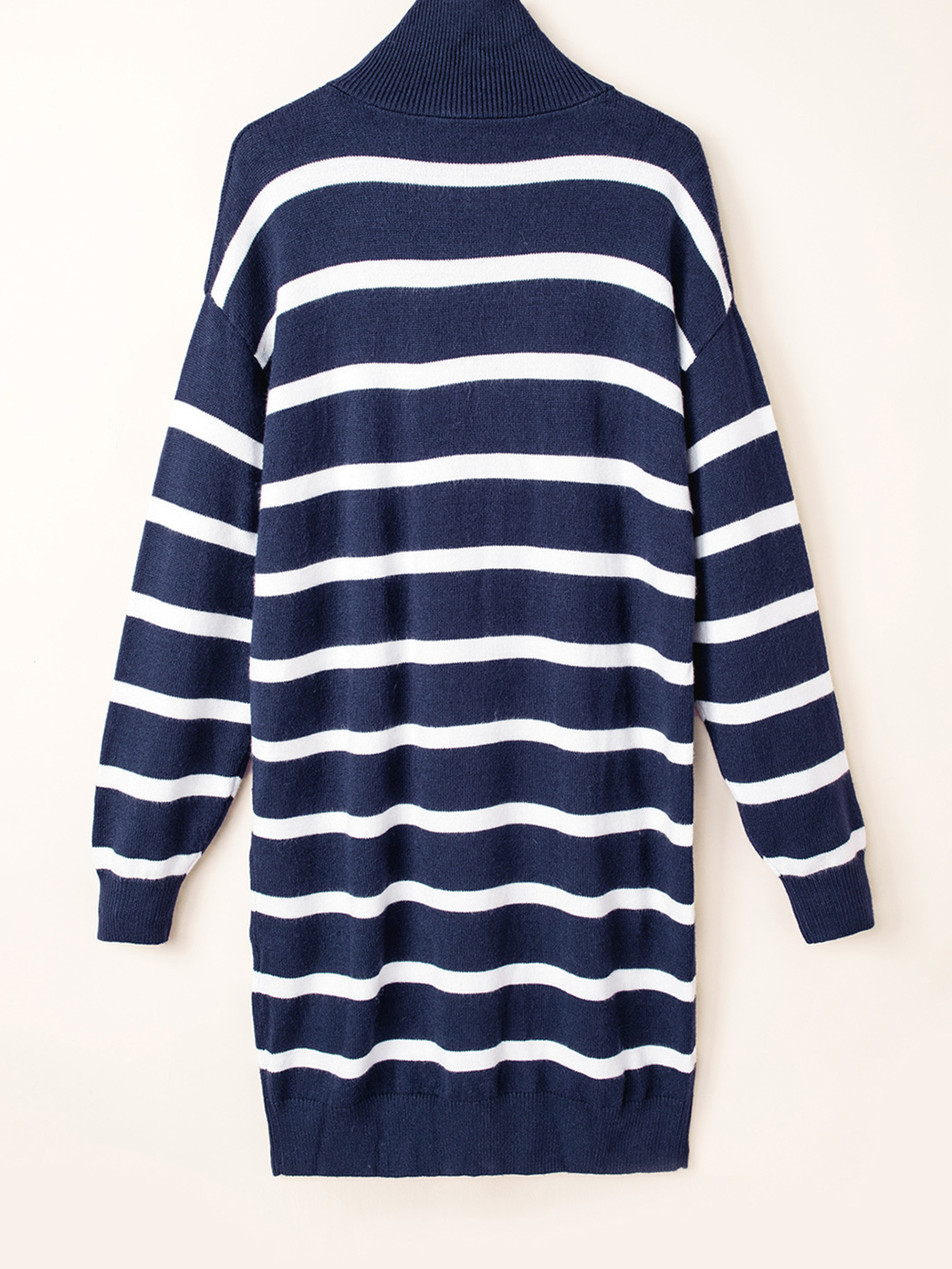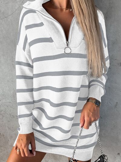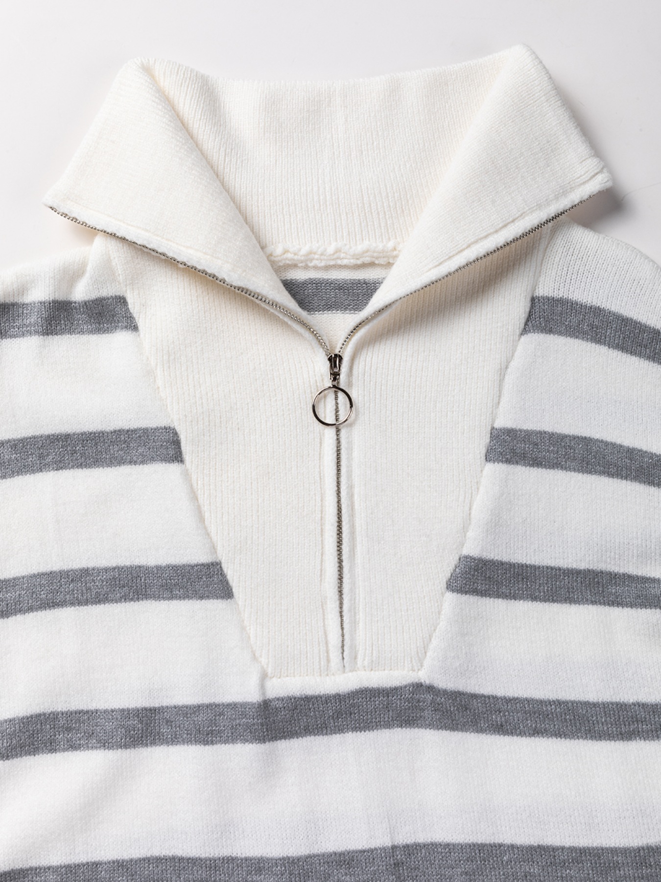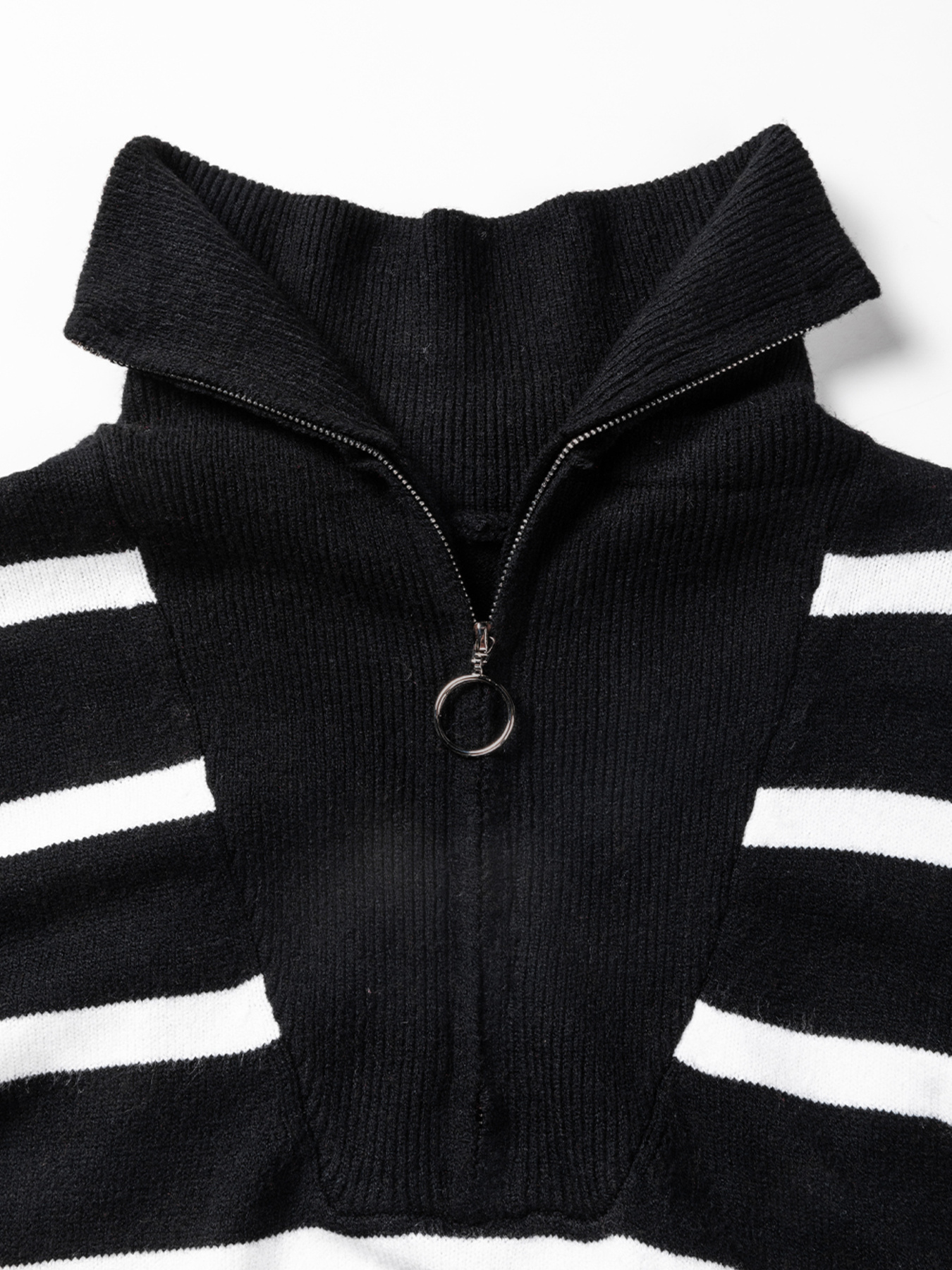Striped O-ring Zip Collared Loose Sweater Mini Dress