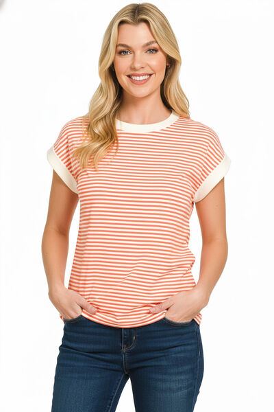 Striped Round Neck Short Sleeve Contrast Trim T-Shirt