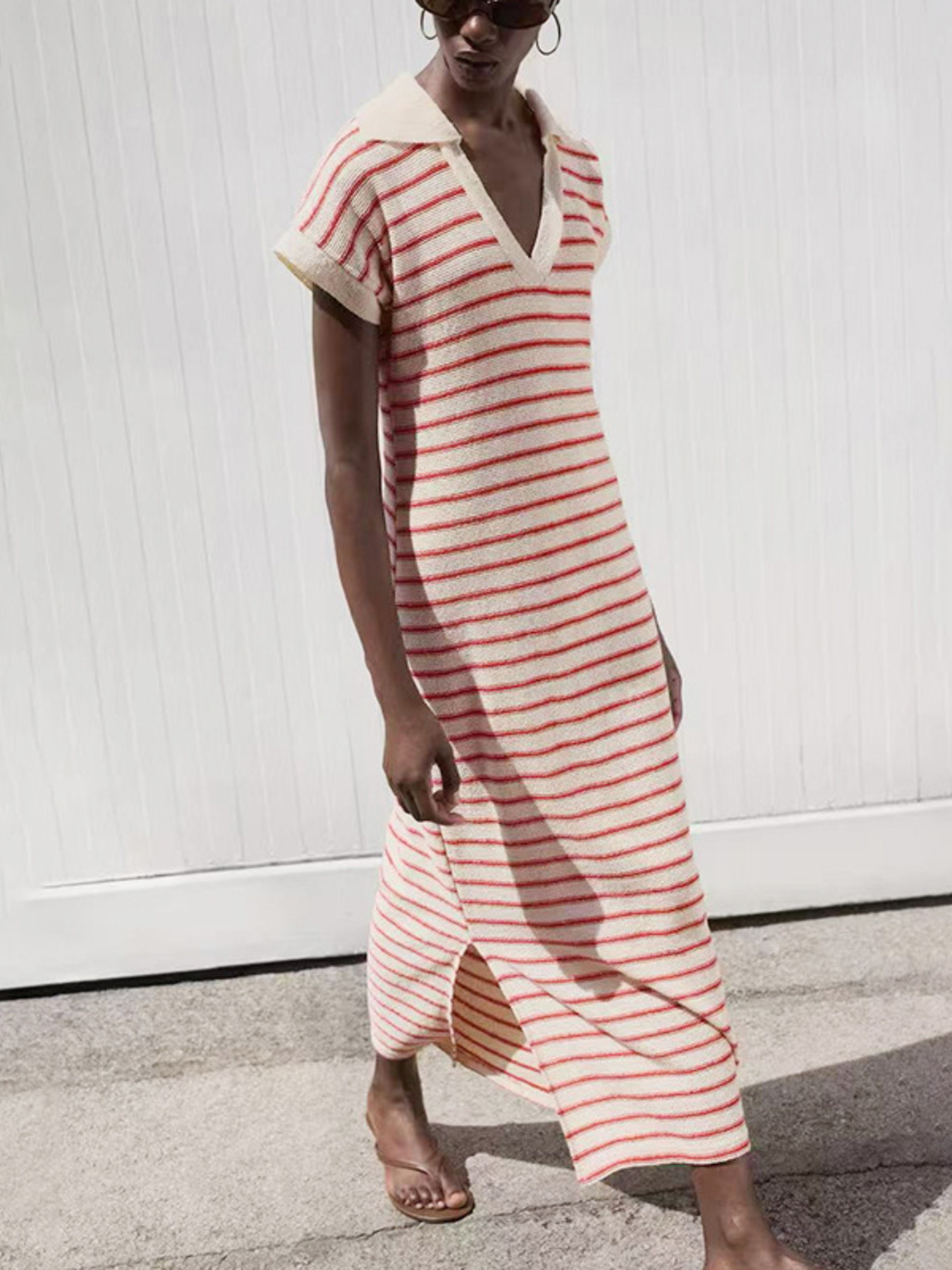 Striped Slit Short Sleeve Maxi Dress