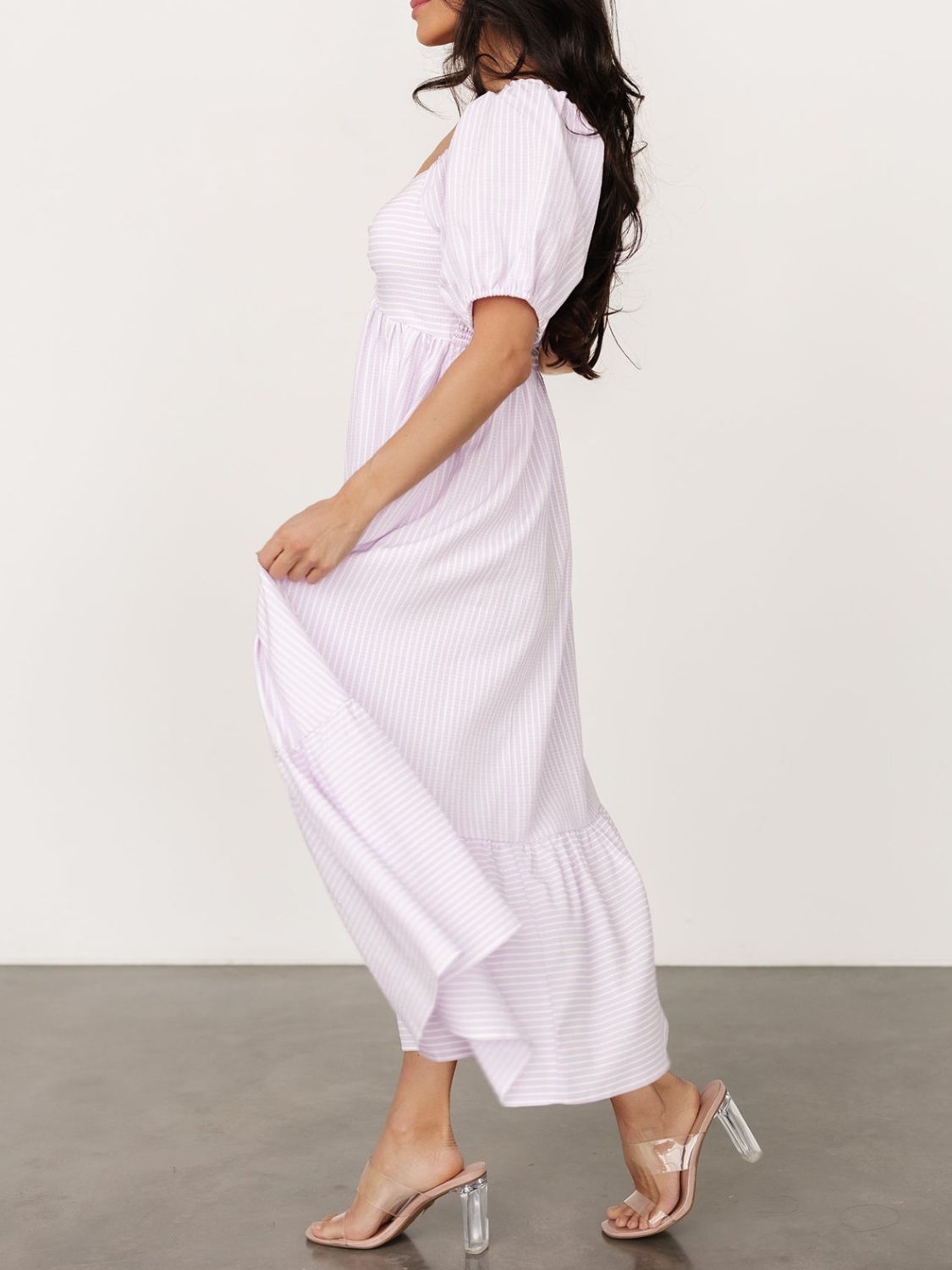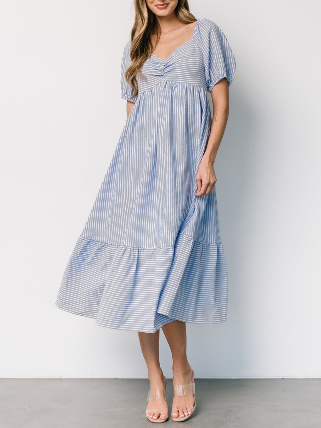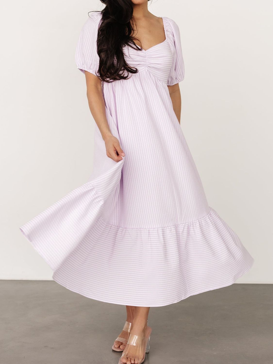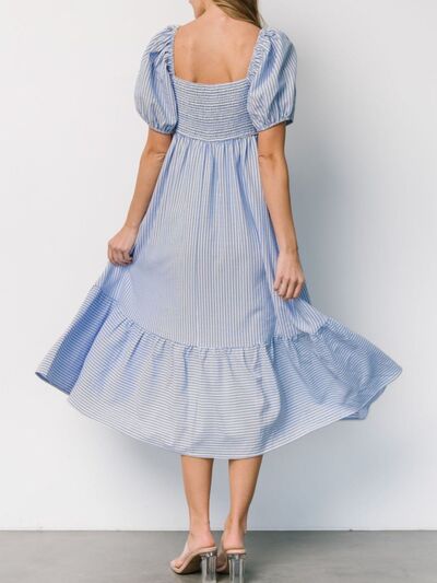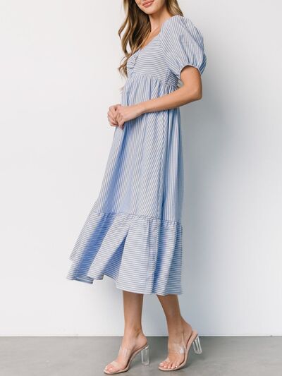 Striped Sweetheart Neck Puff Sleeve Midi Dress