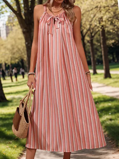 Striped Tie Neck Midi Cami Dress