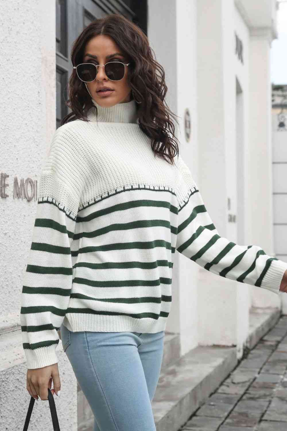Striped Turtleneck Drop Shoulder Sweater
