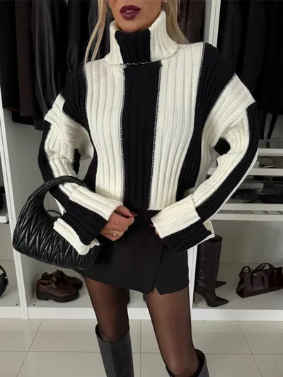 Striped Turtleneck Dropped Shoulder Sweater