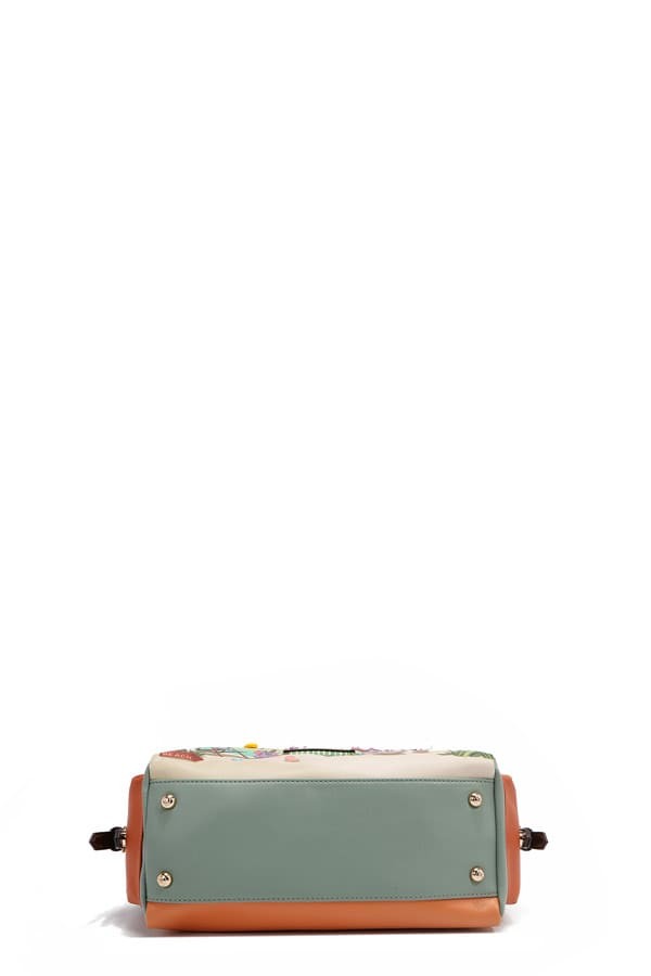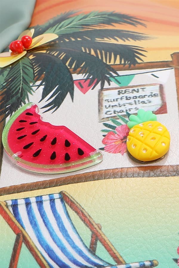 - Front is embellished with resin fruits, beaded embellishments and trims