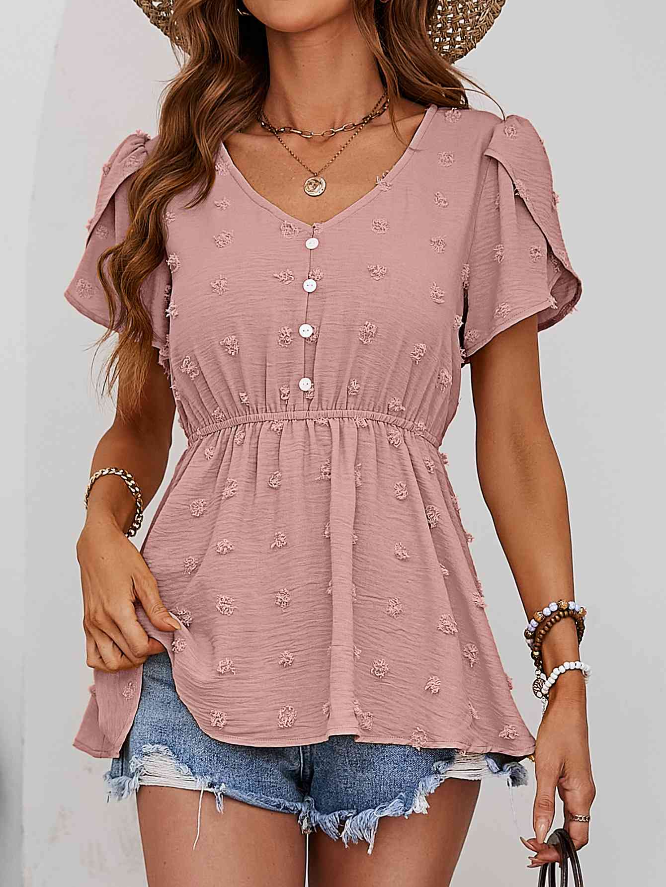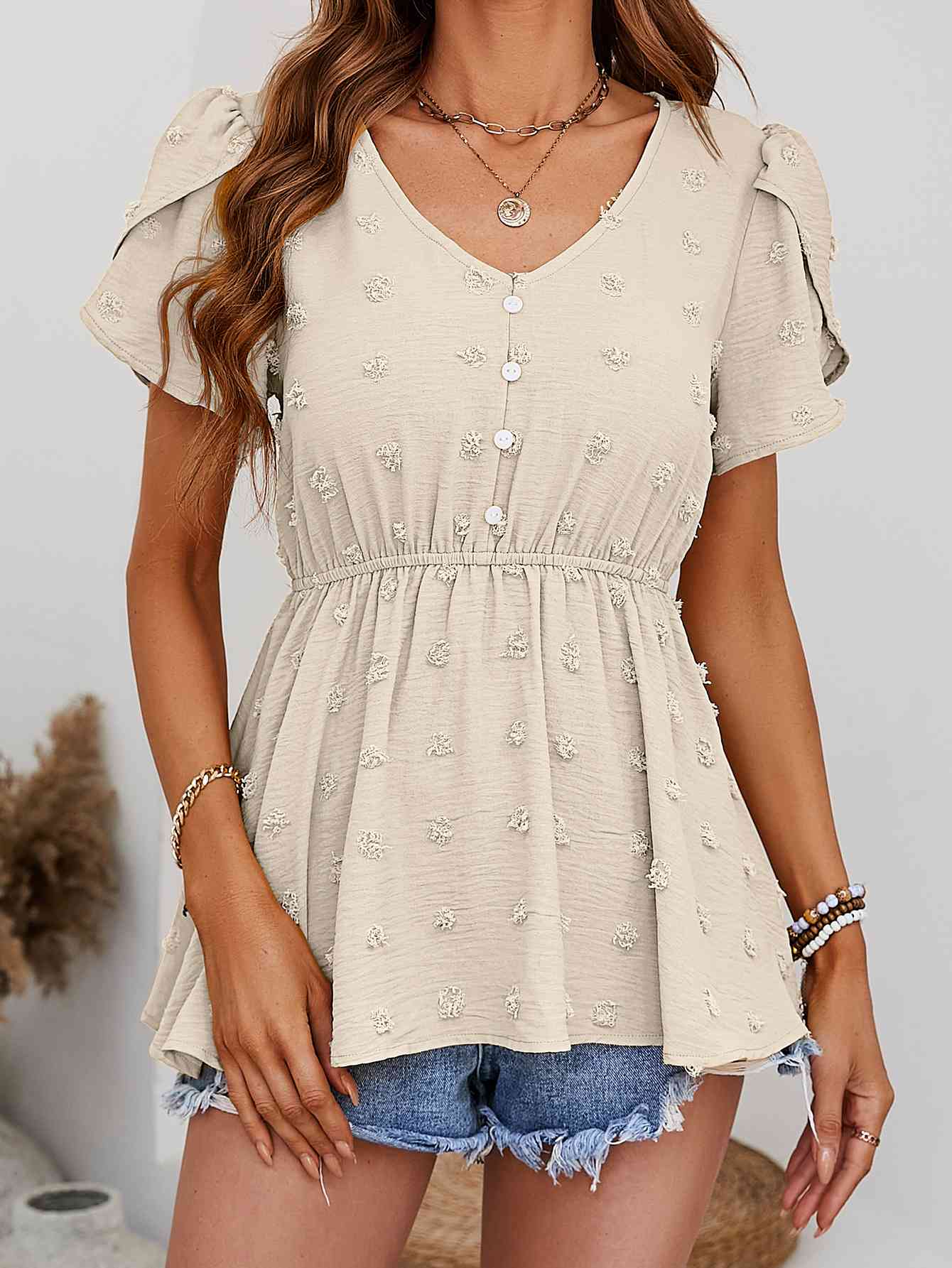 Swiss Dot Buttoned Petal Sleeve Peplum Blouse