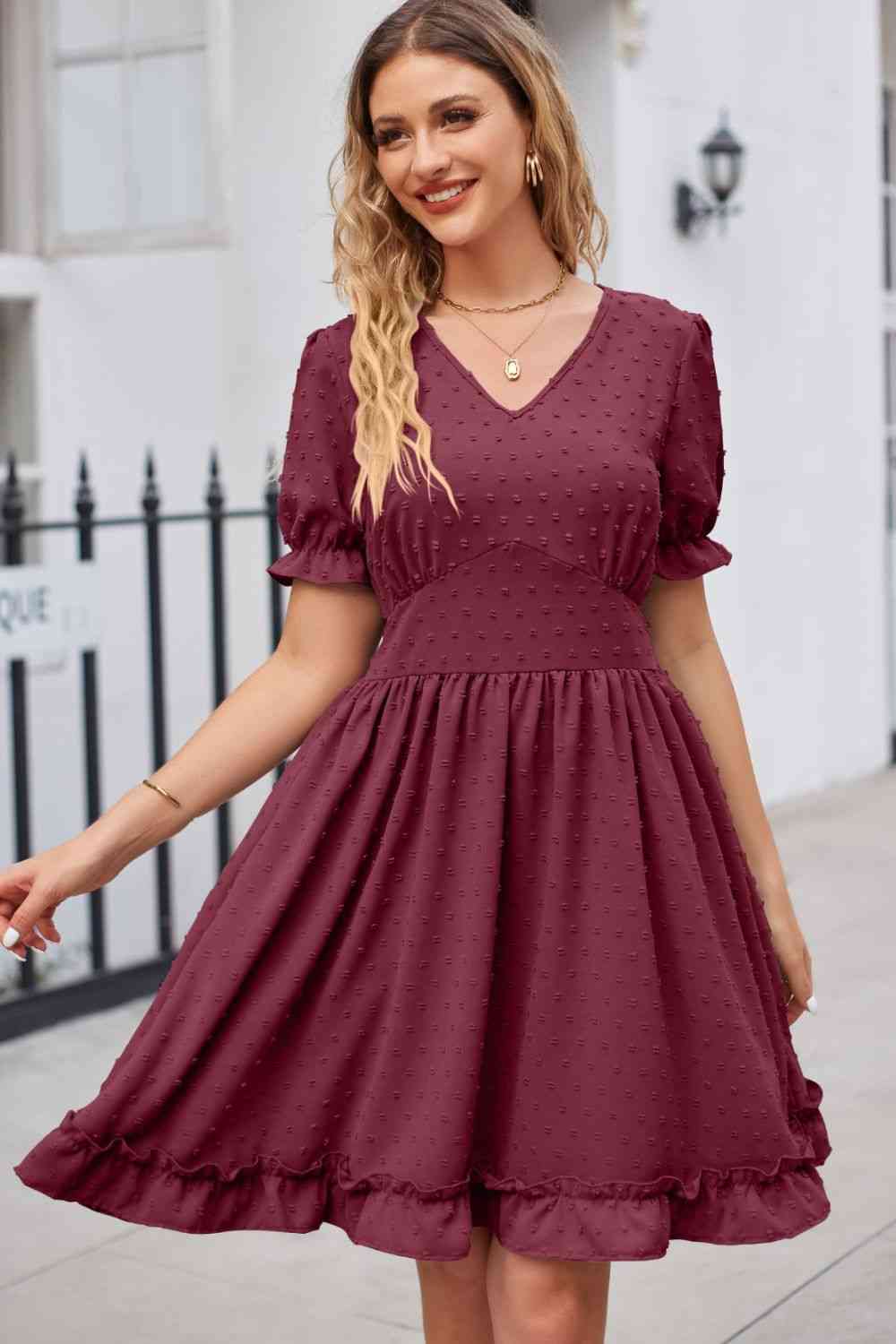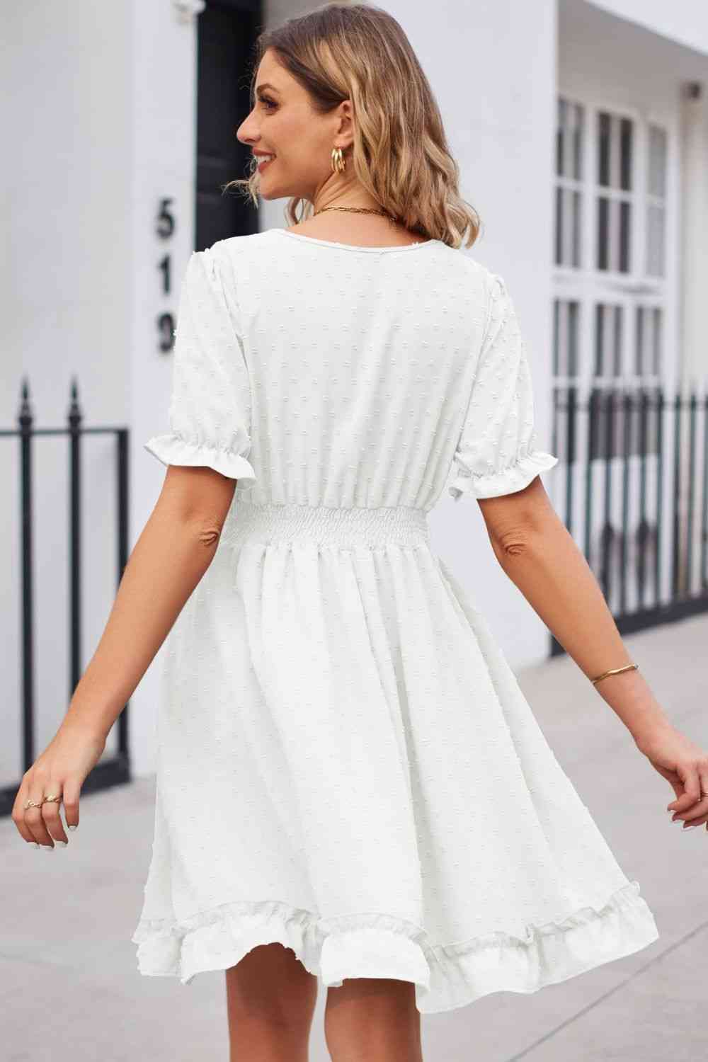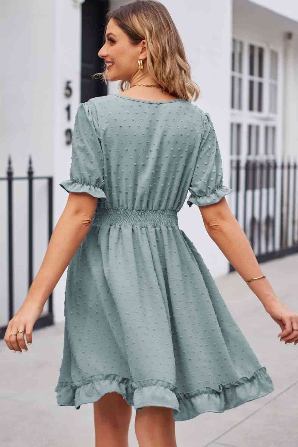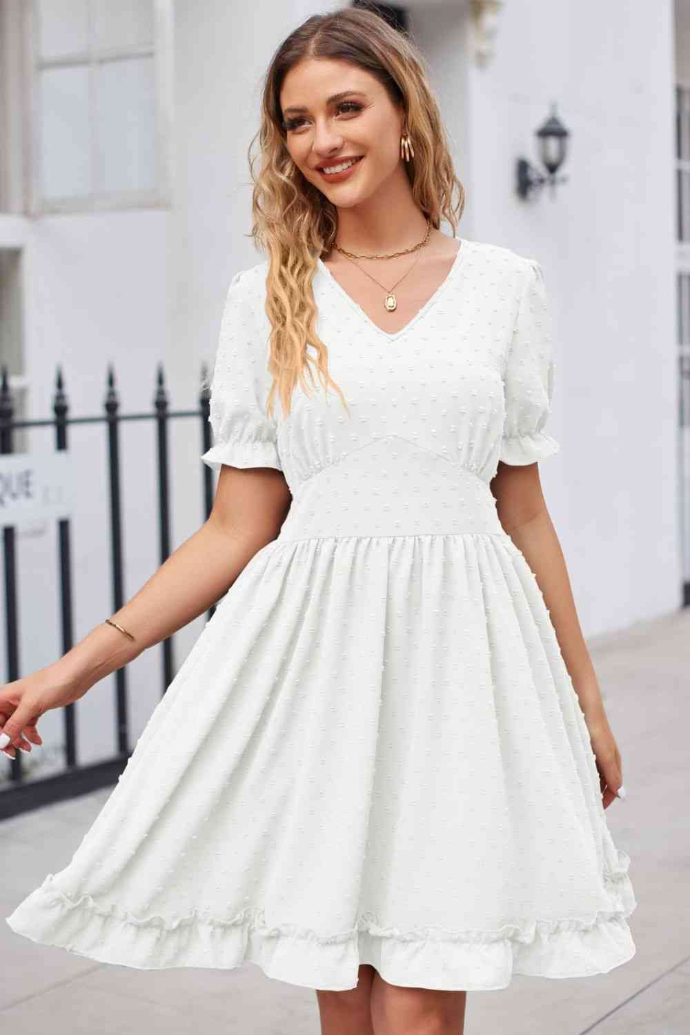 Swiss Dot Frill Trim Flounce Sleeve V-Neck Dress