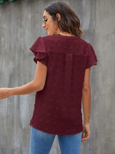 Swiss Dot Notched Flutter Sleeve Blouse