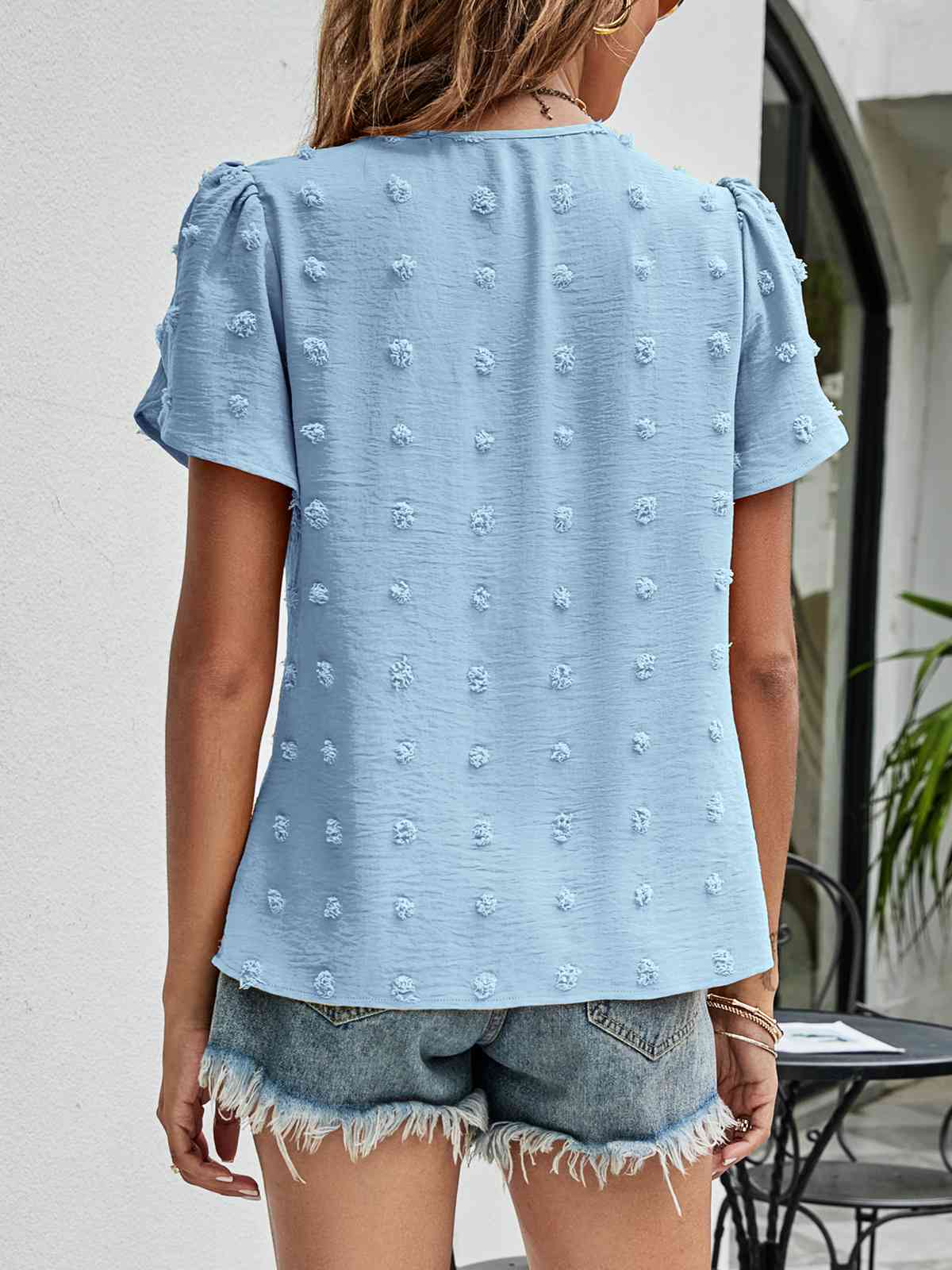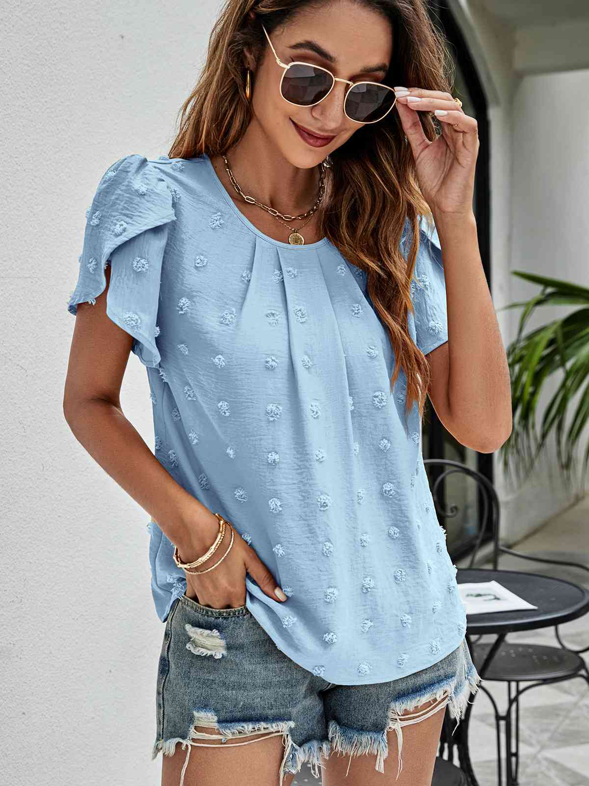 Swiss Dot Round Neck Petal Sleeve Top