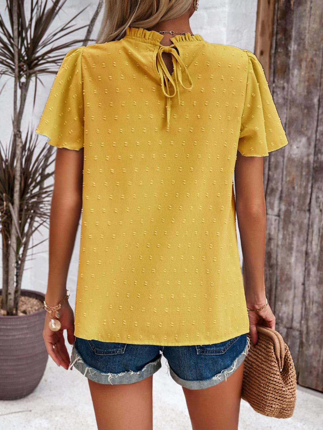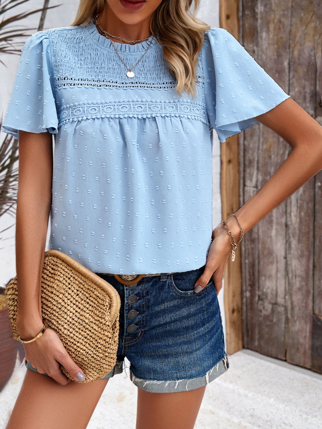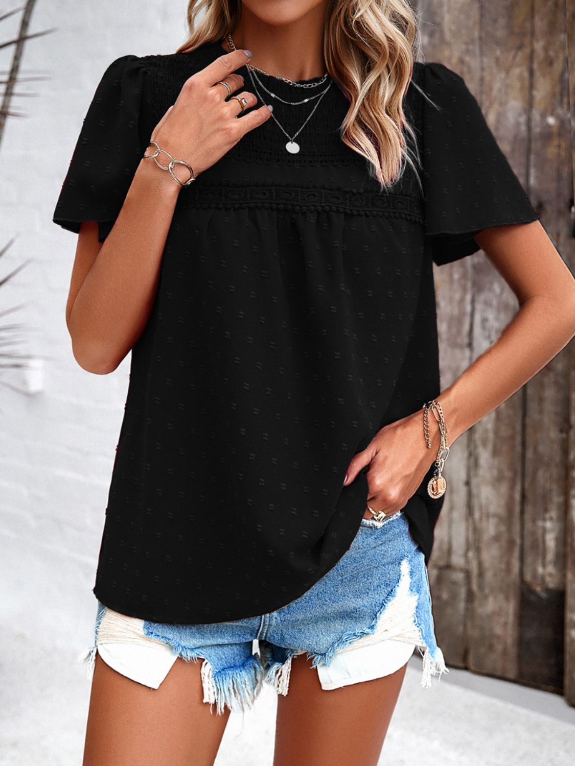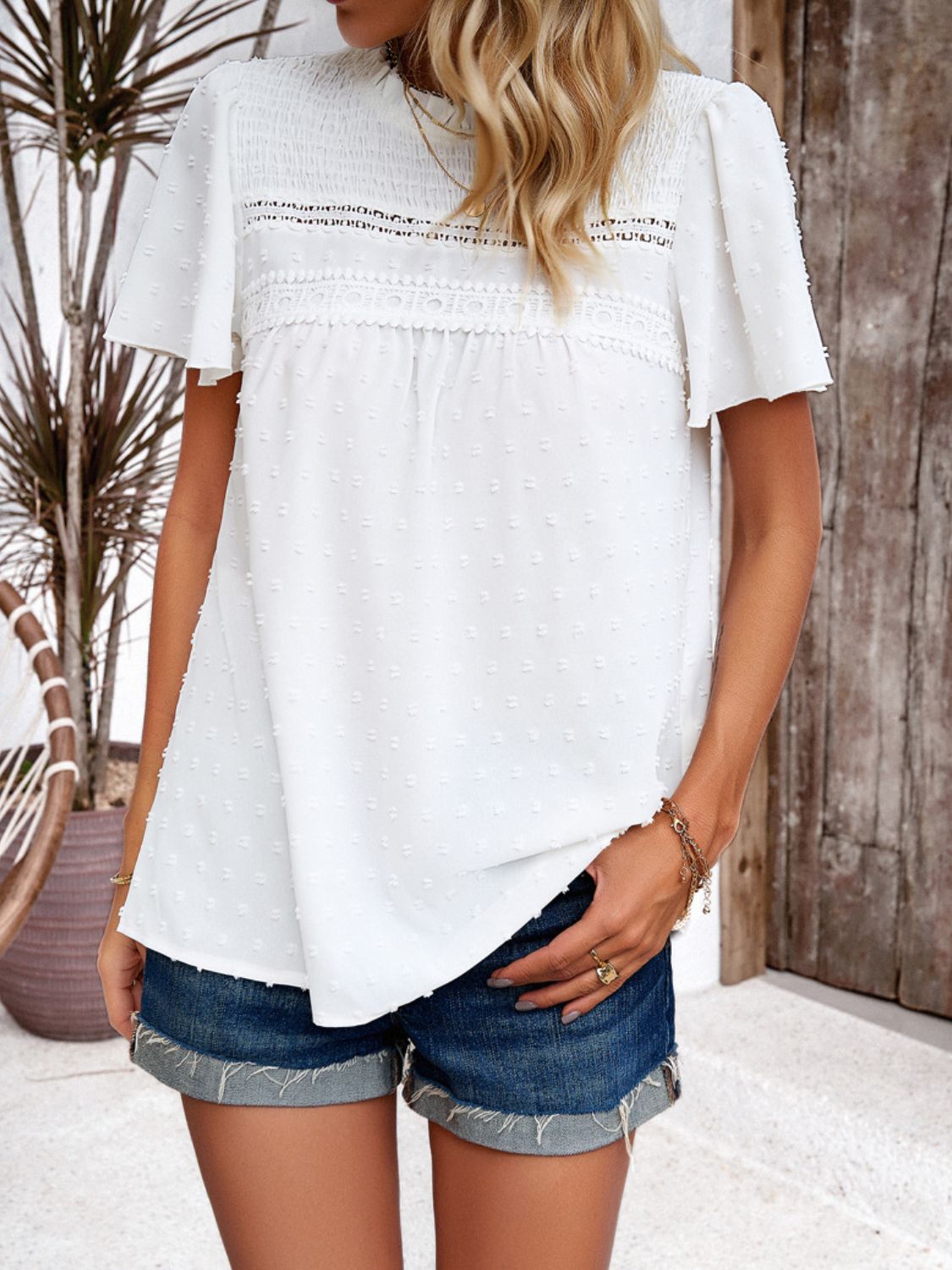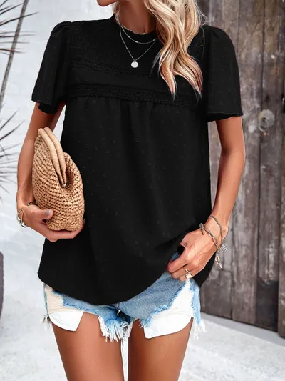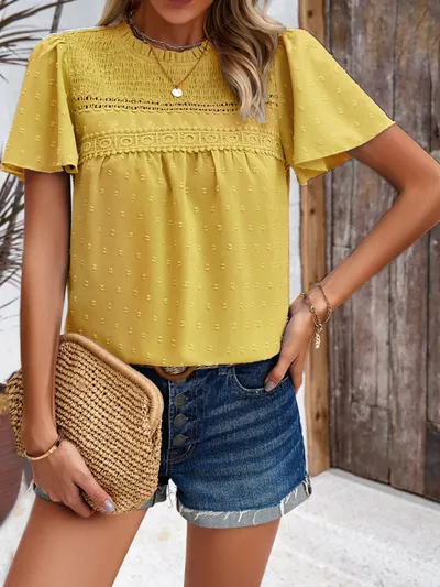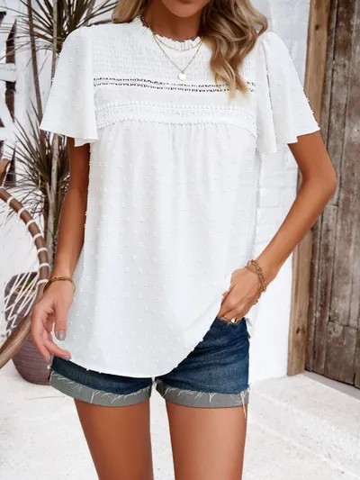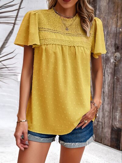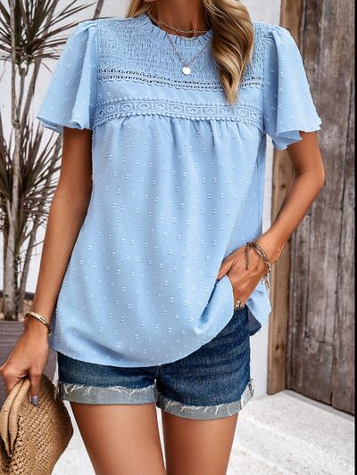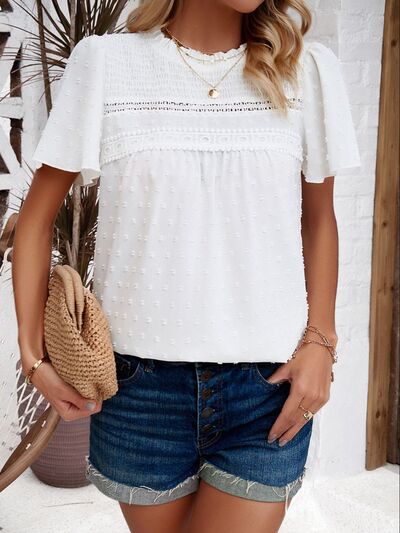 Swiss Dot Smocked Round Neck Short Sleeve Blouse