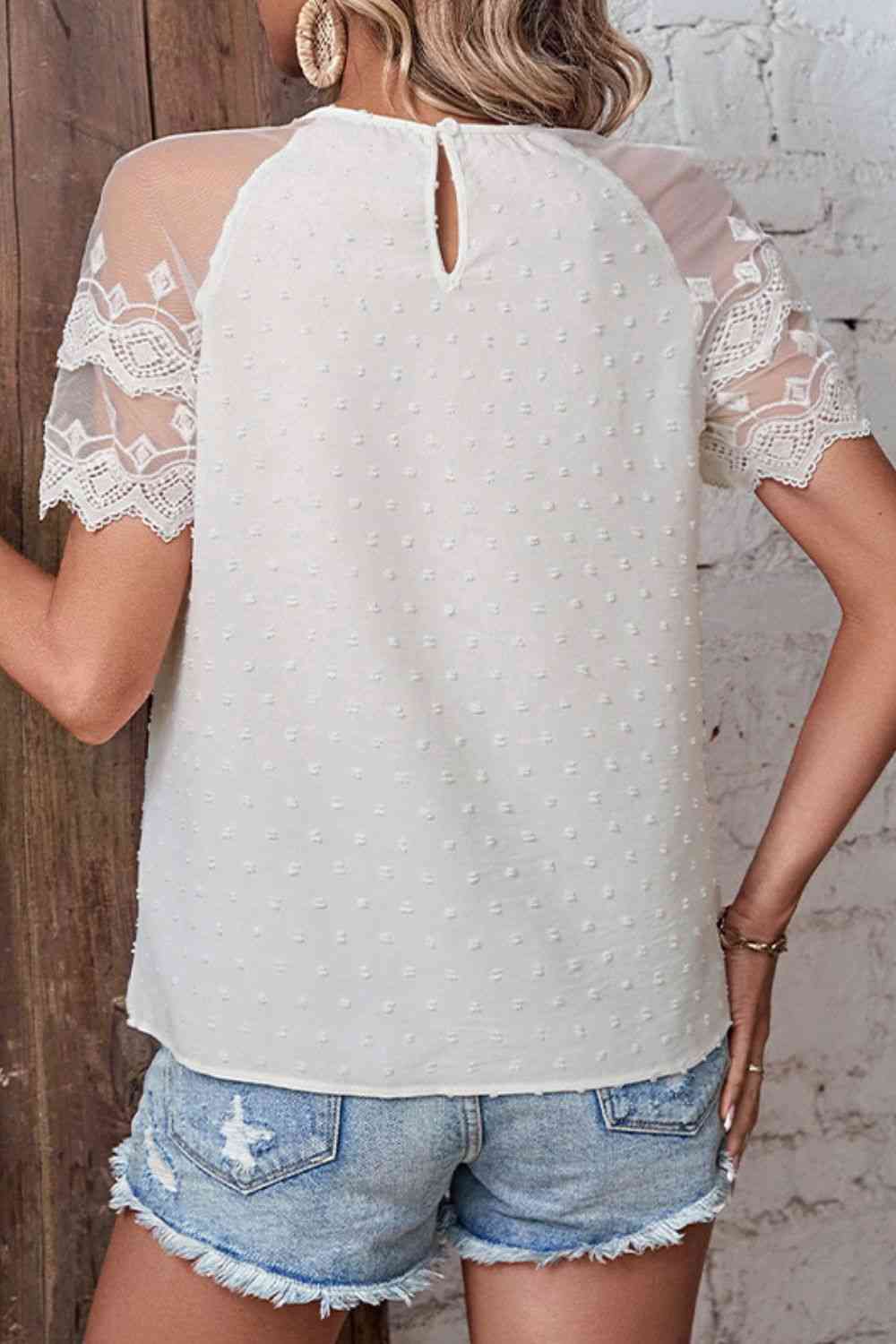 Swiss Dot Spliced Lace Round Neck Blouse