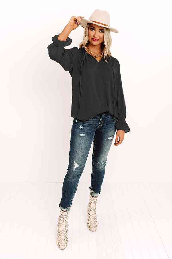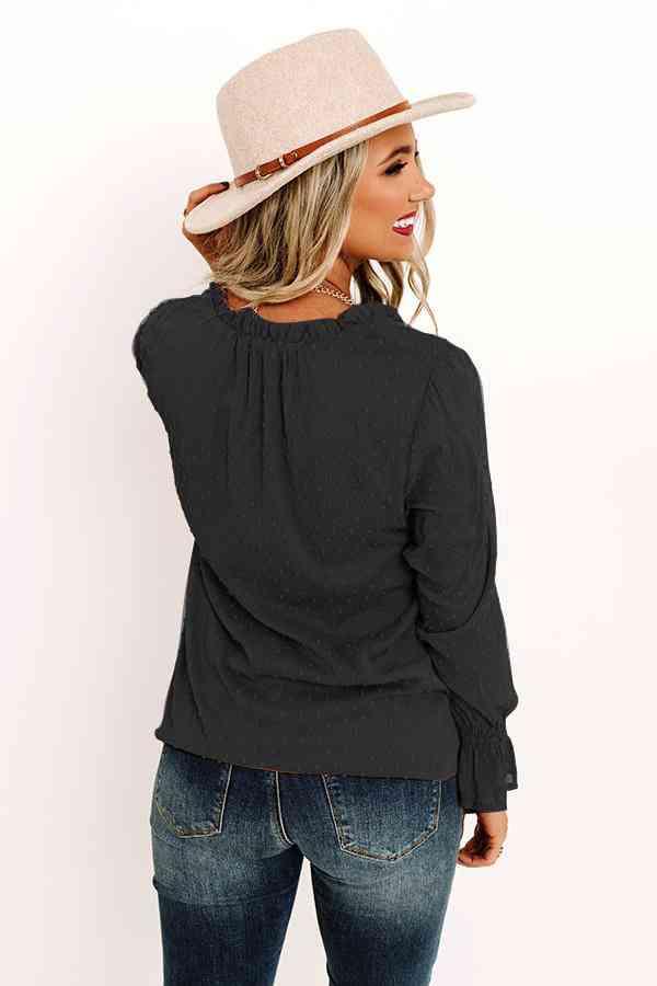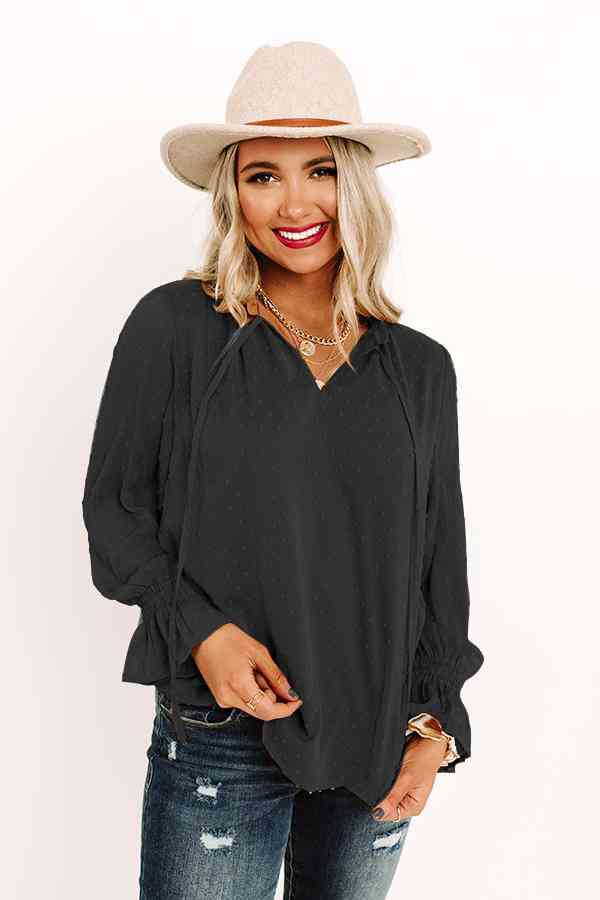 Swiss Dot Tie Neck Flounce Sleeve Blouse