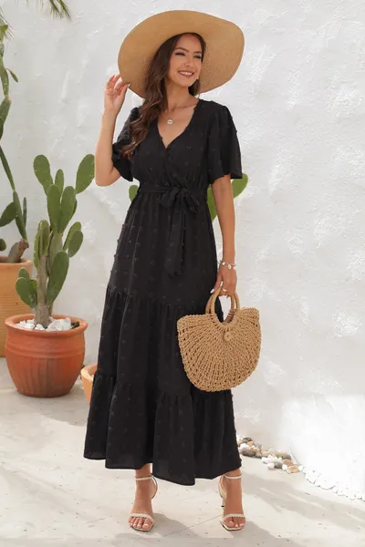 Swiss Dot Tied Surplice Short Sleeve Dress