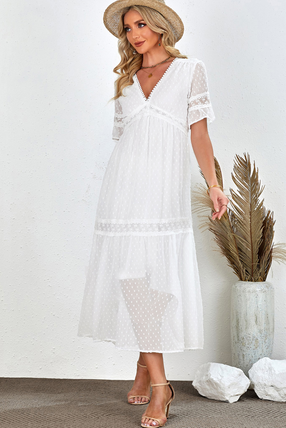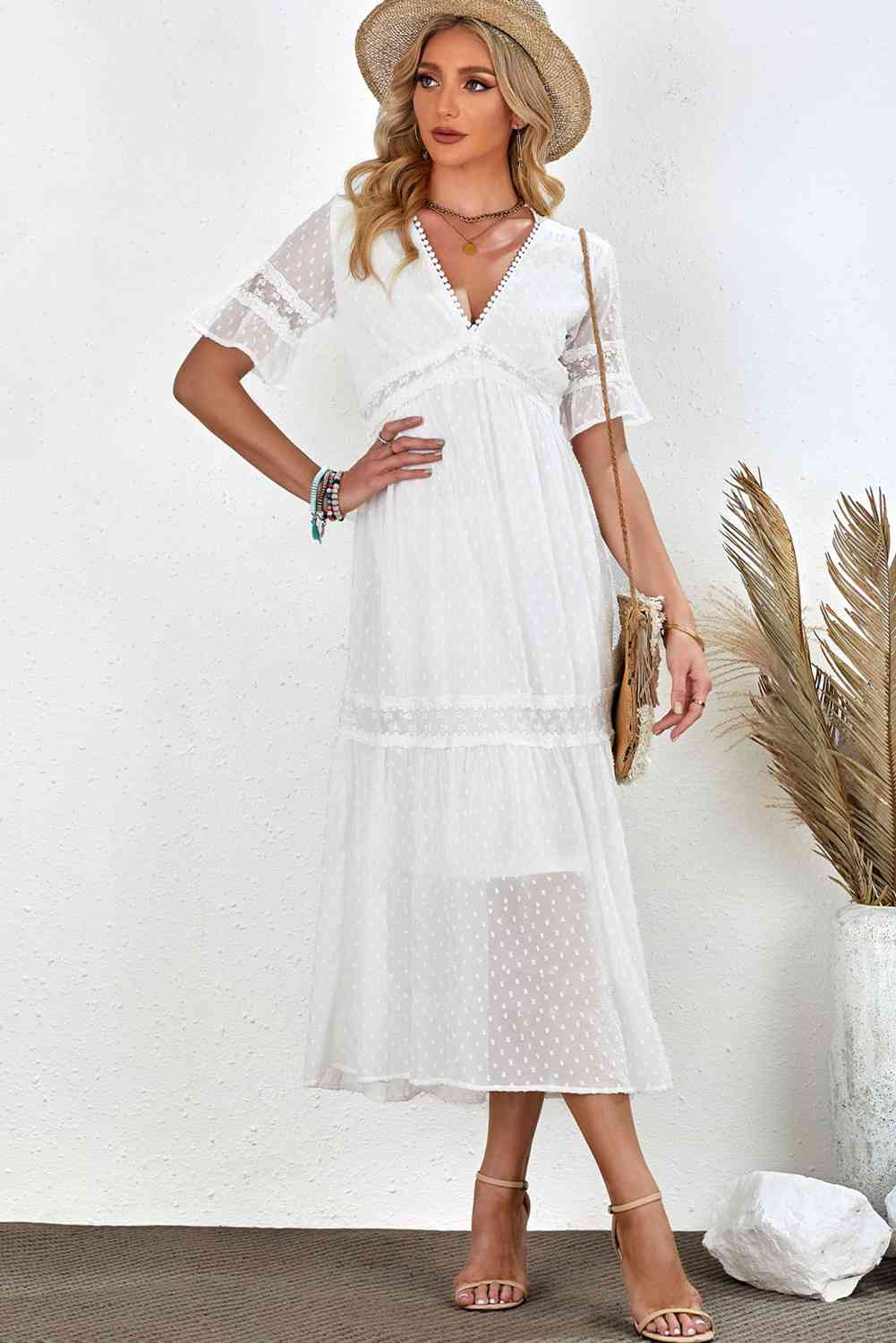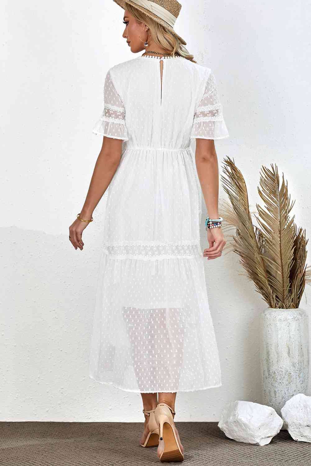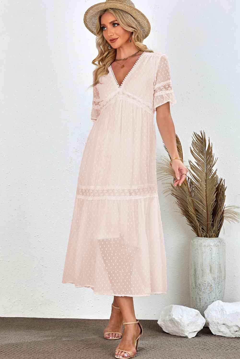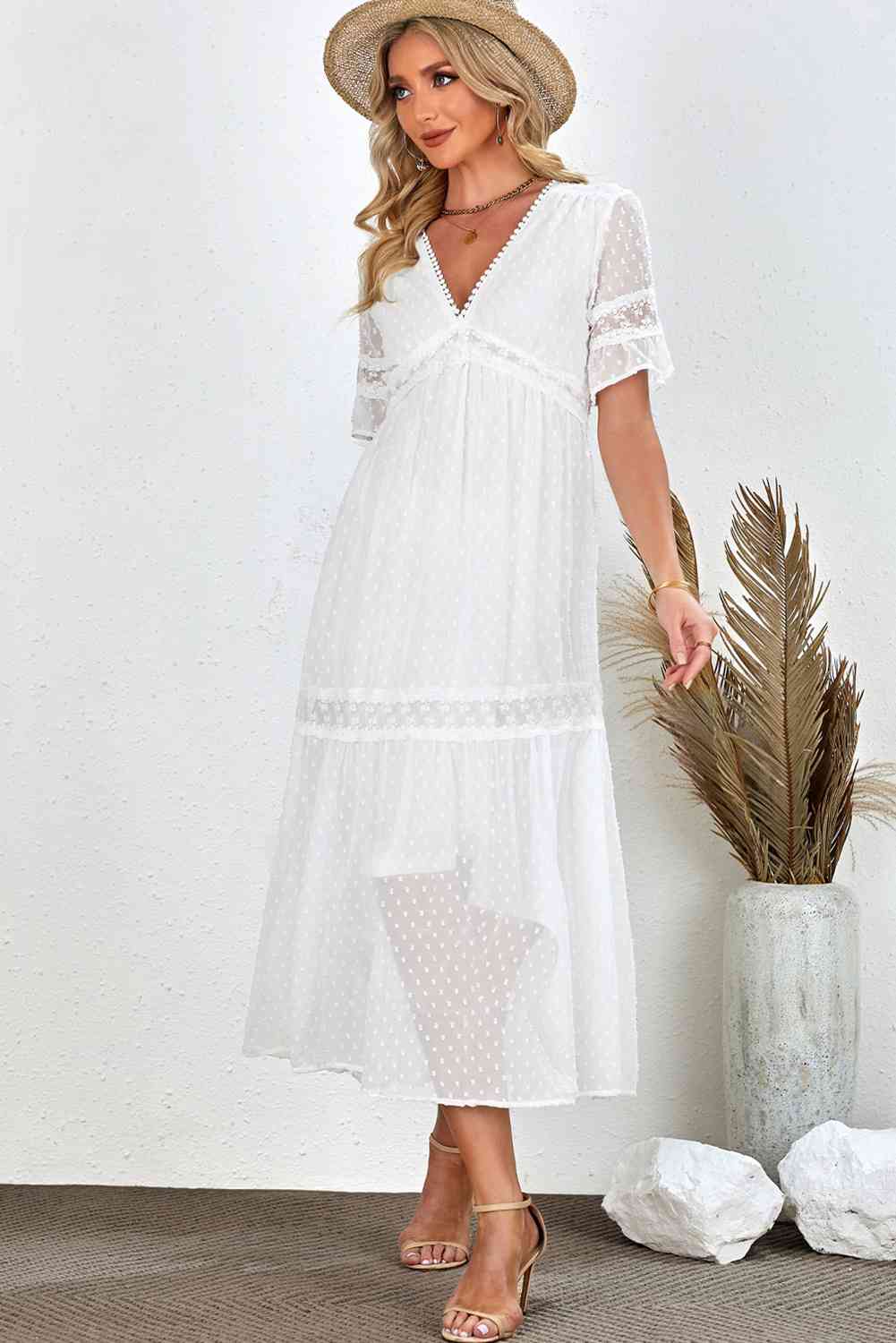 Swiss Dot V-Neck Short Sleeve Midi Dress