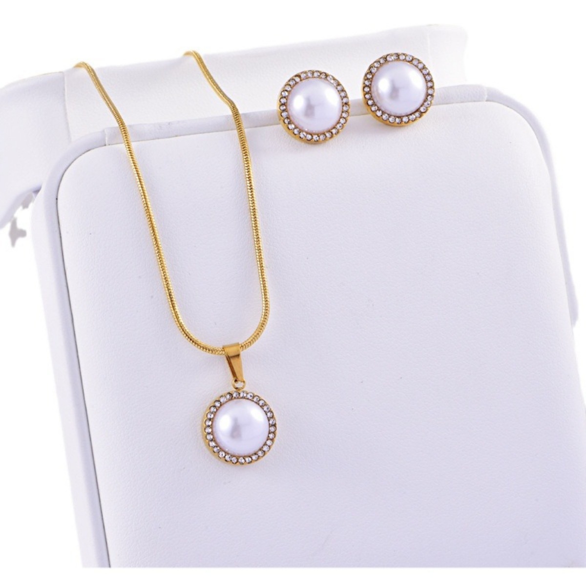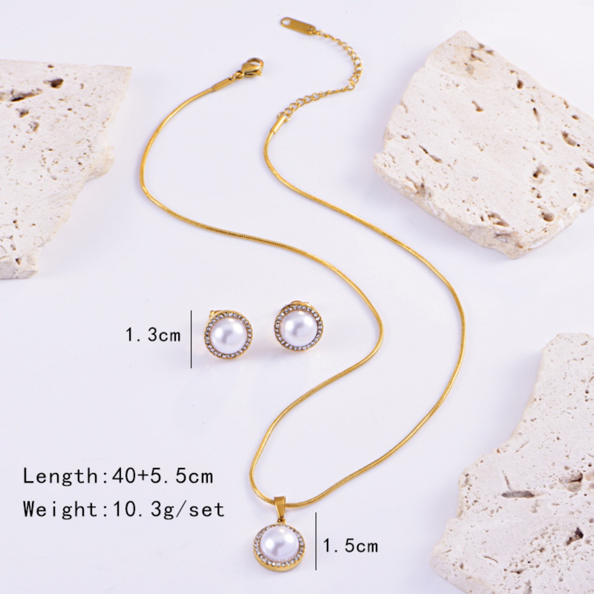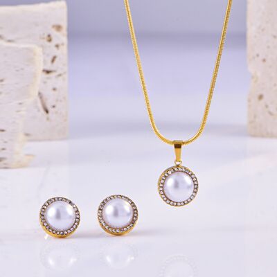 Synthetic Pearl 18K Gold-Plated Rhinestone Necklace and Earrings Jewelry Set
