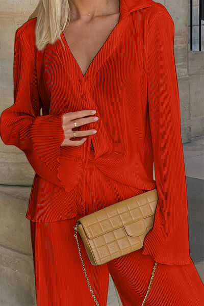 Textured Button Up Collared Neck Top and Pants Set