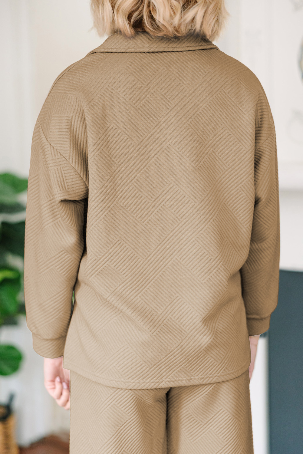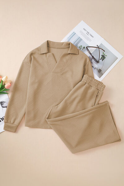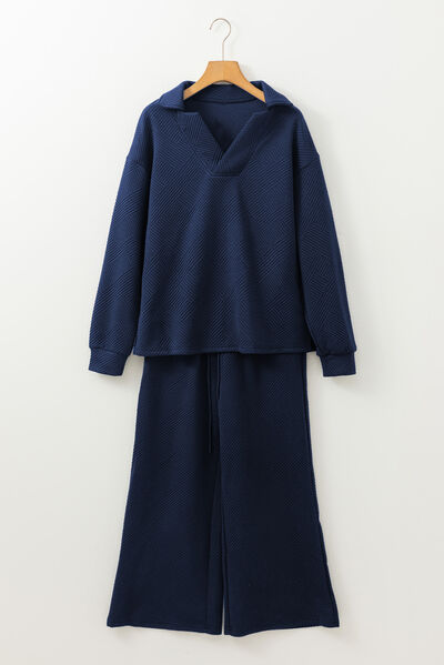 Textured Collared Neck Top and Wide Leg Pants Set